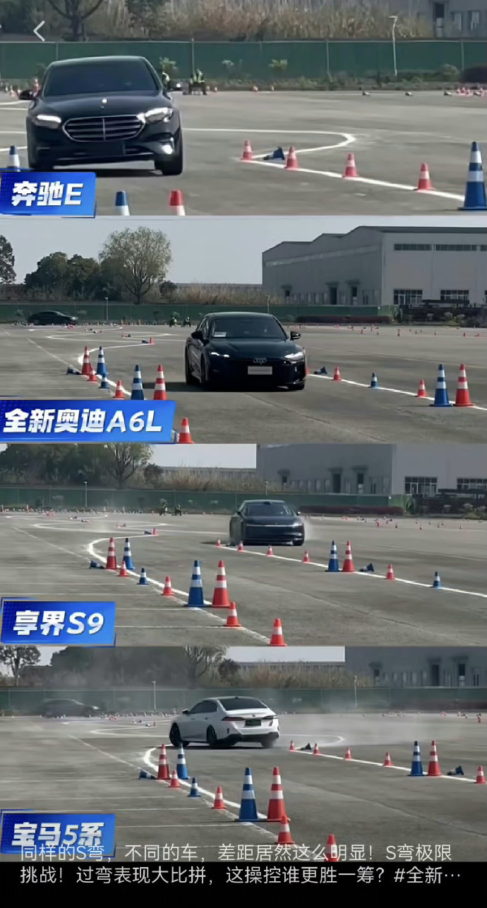 先说这个“网传测试”,弄了BBA和享界S9几辆行政级轿车玩绕桩。绕桩是啥?我前面科普过,就是按蛇形穿桩,不碰桩测出最高平均速度。