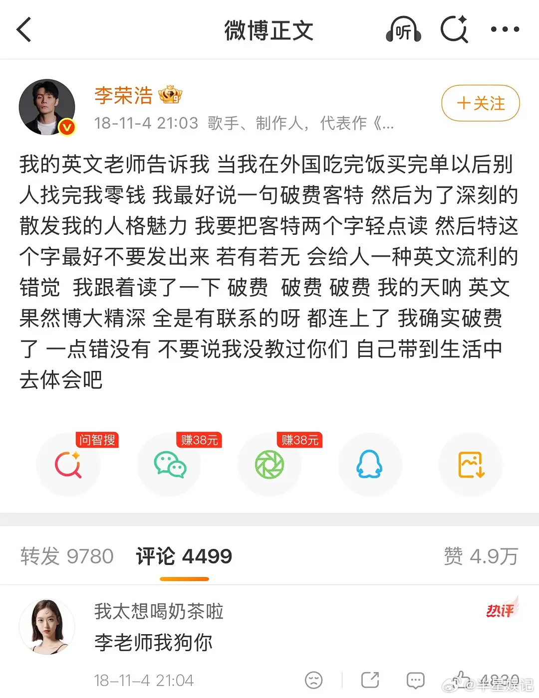 李荣浩凌晨回应单依纯!他行文措辞让看客好爽单依纯发长文回应