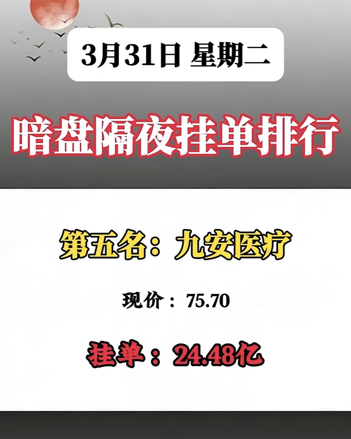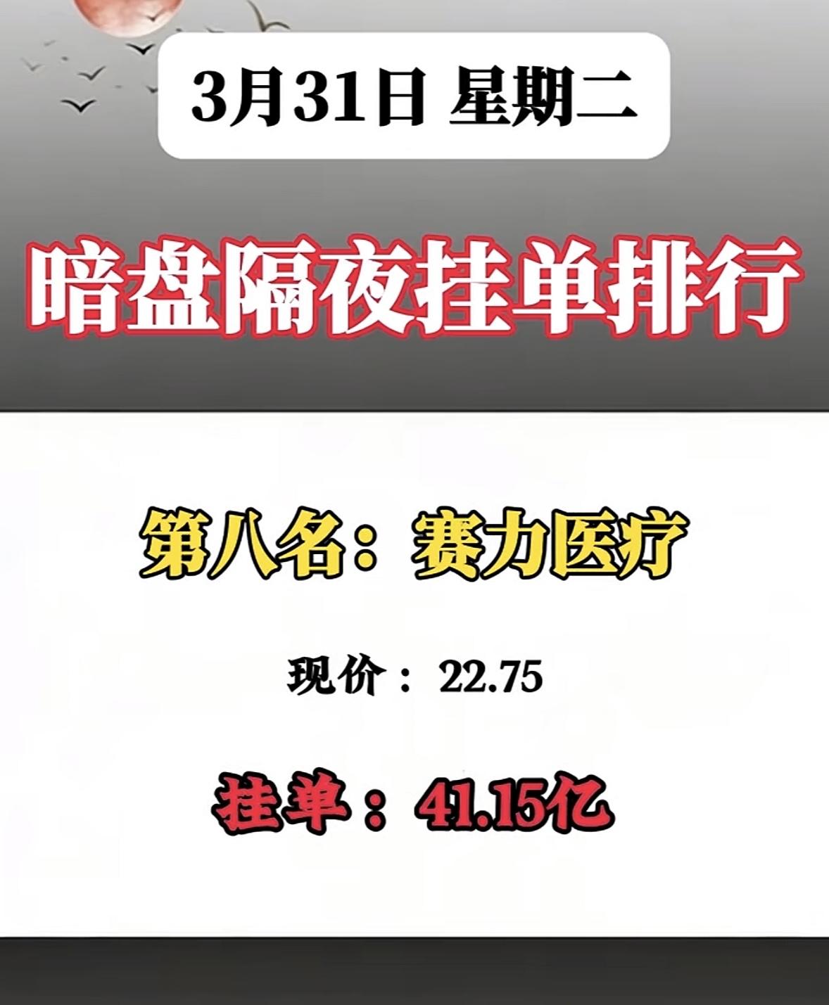 3月31日周二暗盘隔夜挂单排行榜出炉 赛力医疗3月31日暗盘隔夜挂单排行第八,这情况有点意思。现价22.75元,挂单高达41.15亿,可见市场关注度不低。 从之前数据看,3月3日时它的股价是21.03元,总市值44.18亿。而截至13时10分,它涨幅达10.01%,总市值到了48.11亿元。这背后和医药行业大环境有关,现在医药创新加速,器械领域利好频传。像中国胃癌抗体药行业在升级,多地也出台政策推动医疗器械发展。赛力医疗这走势,说不定还有更多惊喜,值得持续关注。