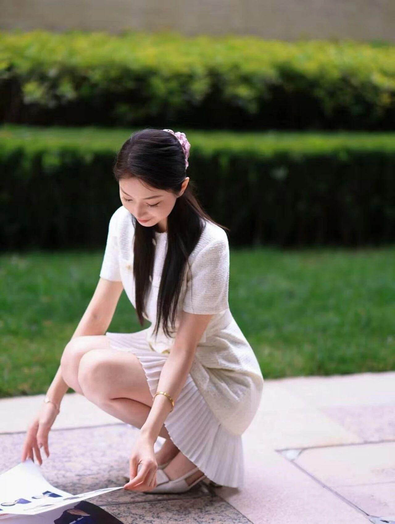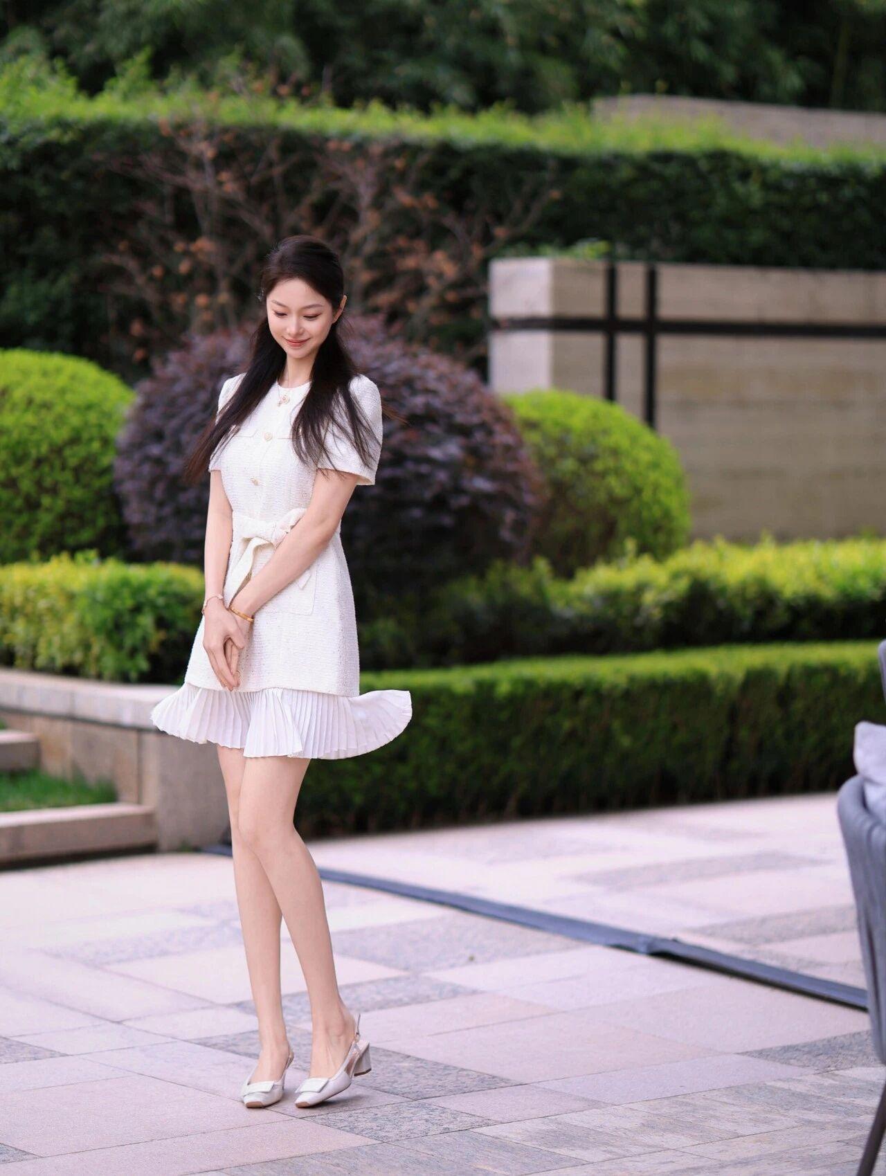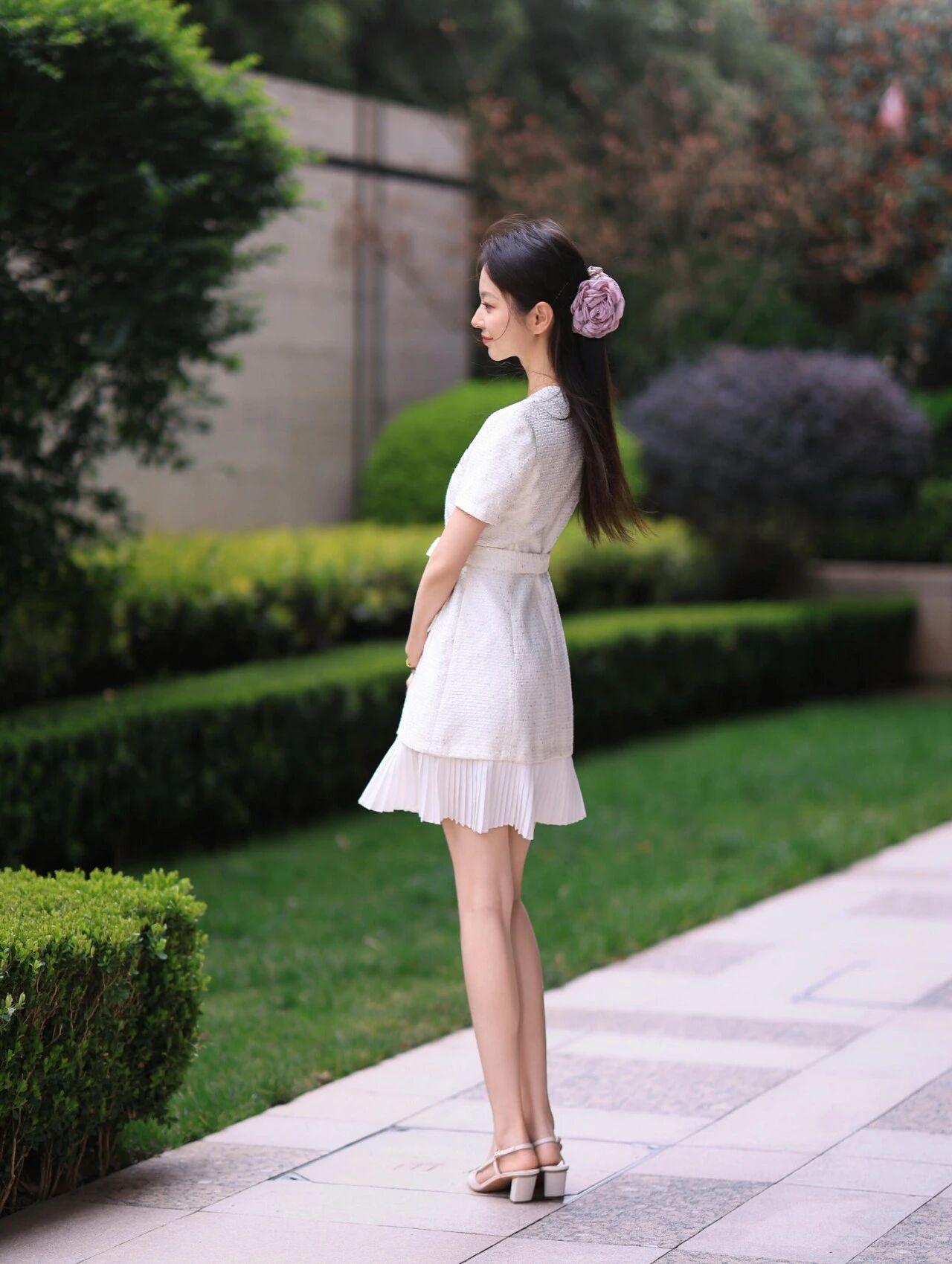 背景是绿意盎然的庭院,修剪整齐的绿植、干净的石板路,营造出清新自然的氛围。她时而俏皮地单脚抬起,时而侧身回眸浅笑,时而温柔地蹲下身,每一个姿态都灵动自然,将小香风的优雅与少女的娇俏完美结合,宛如从油画中走出的法式少女,温柔又迷人。