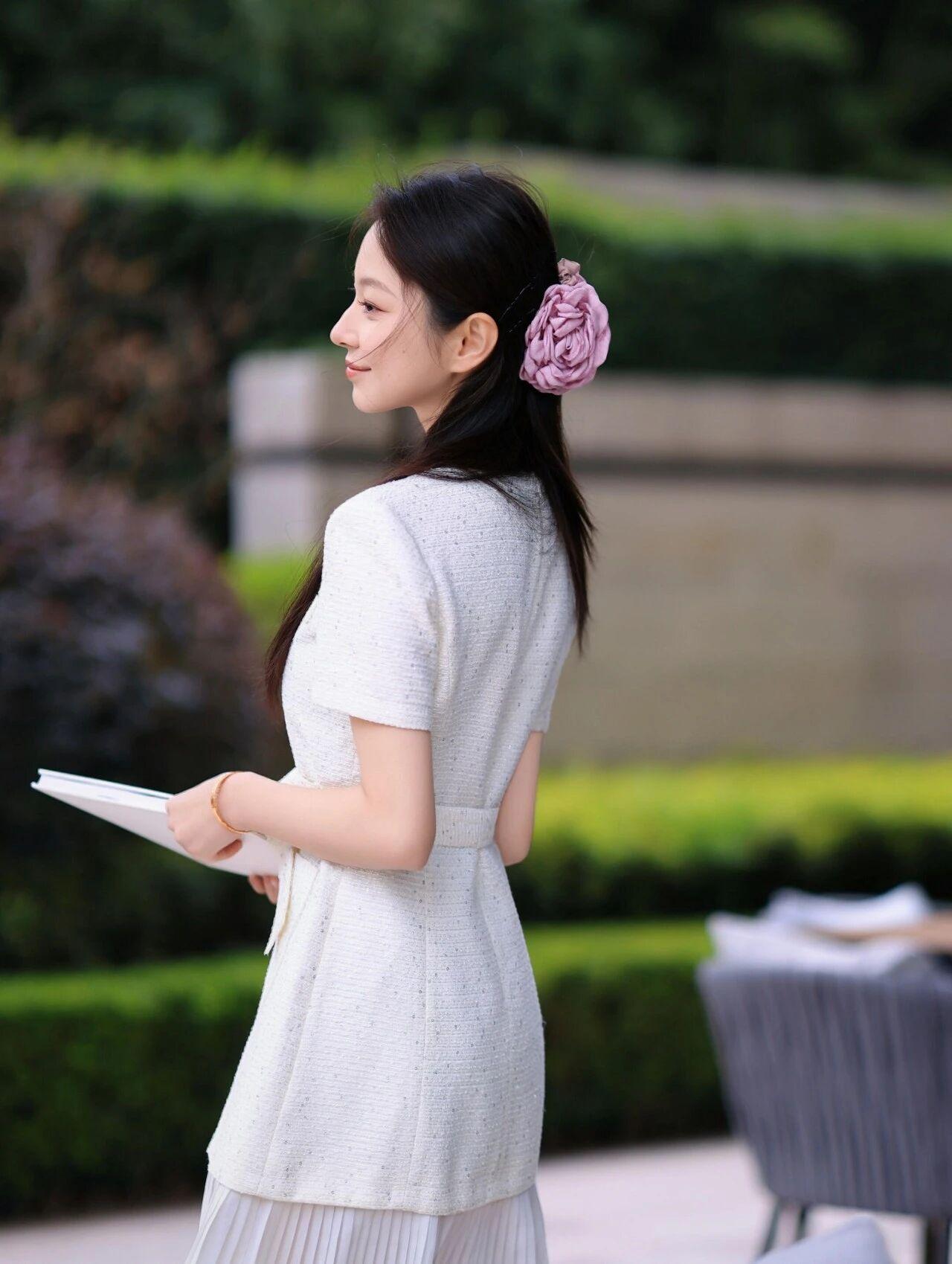 画面中的女子气质温婉,一头乌黑长发半扎起,发间别着一朵淡紫色花朵发饰,增添了几分浪漫与柔美。她身着一袭米白色粗花呢小香风连衣裙,精致的双排扣设计搭配腰间系带,勾勒出纤细腰肢,裙摆处的百褶荷叶边灵动飘逸,尽显少女心。脚踩一双银色低跟凉鞋,简约又不失精致。
