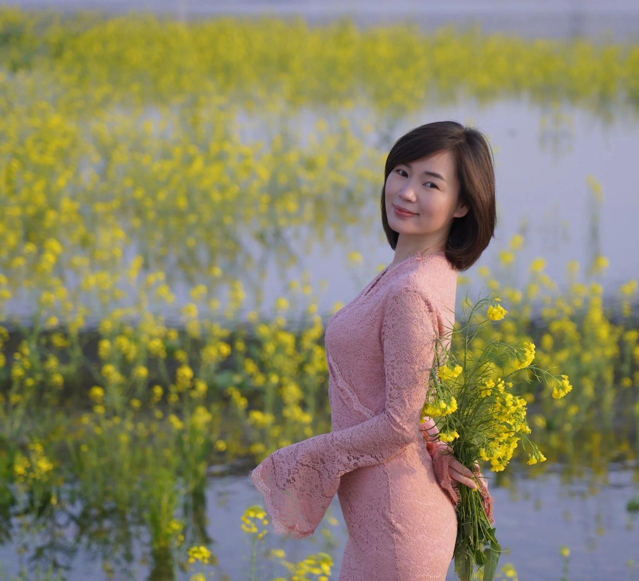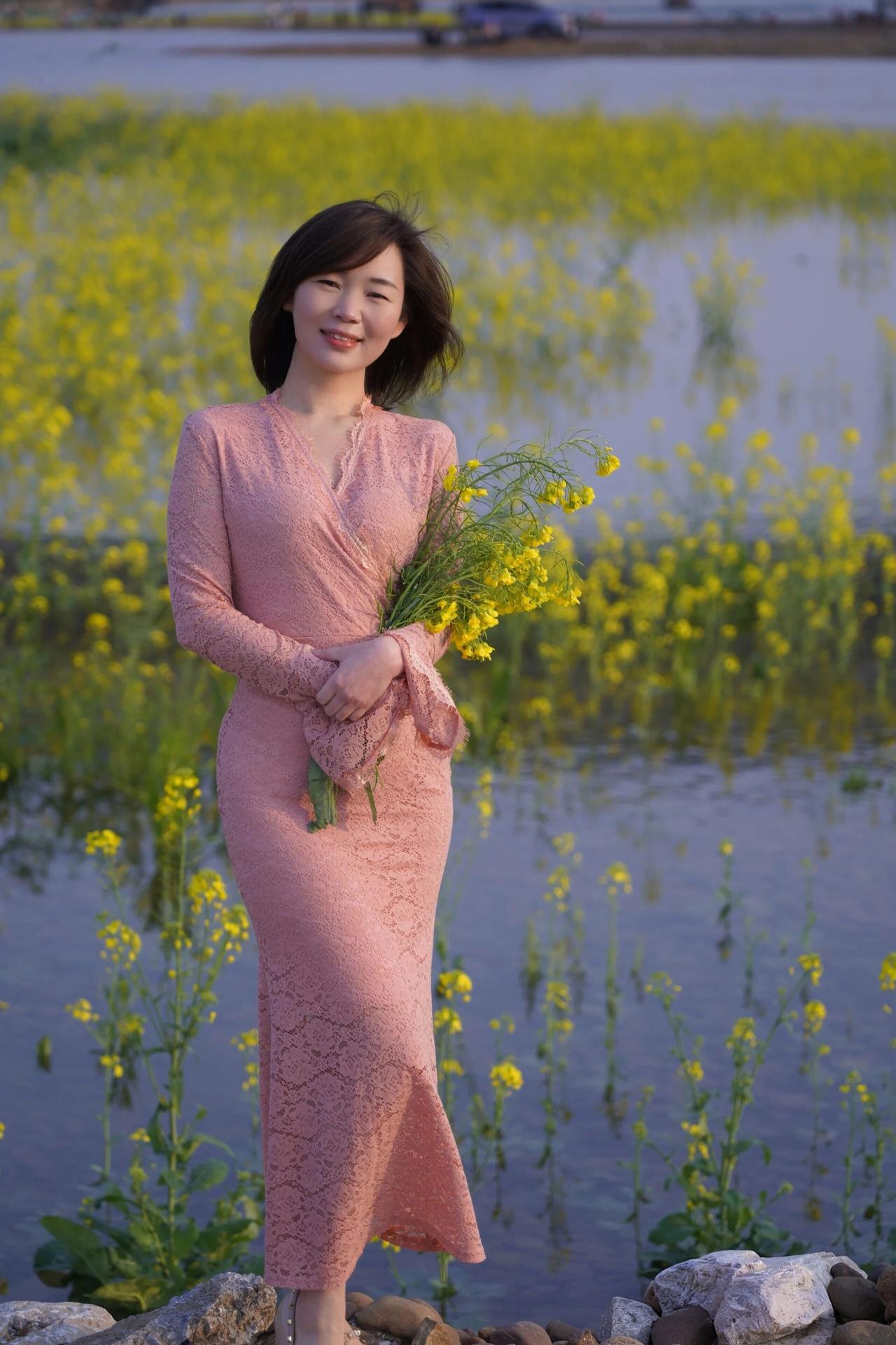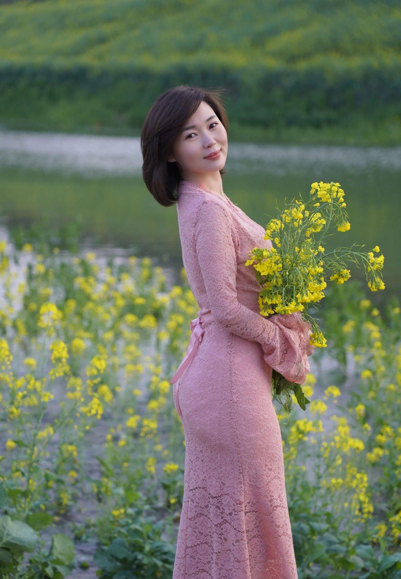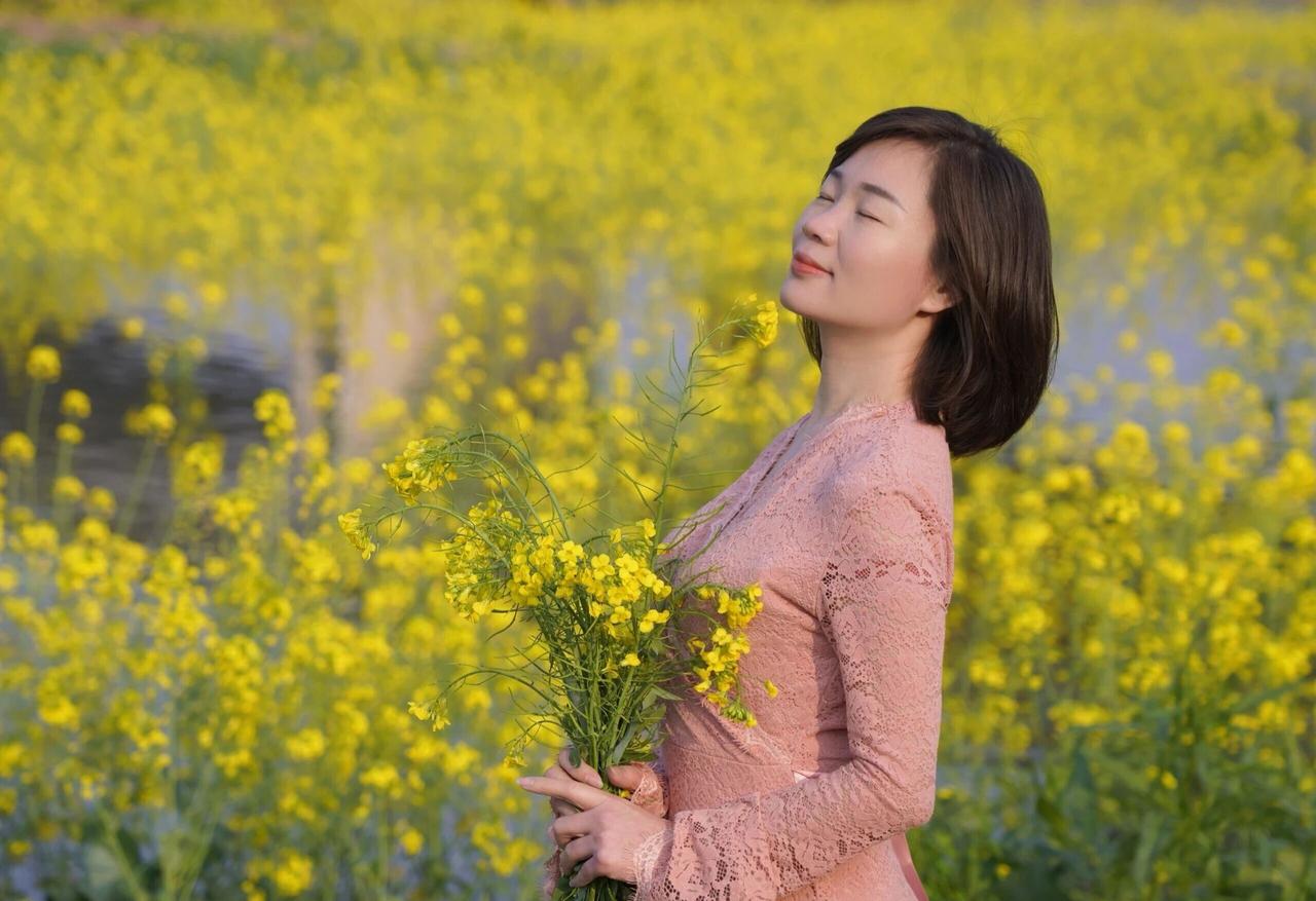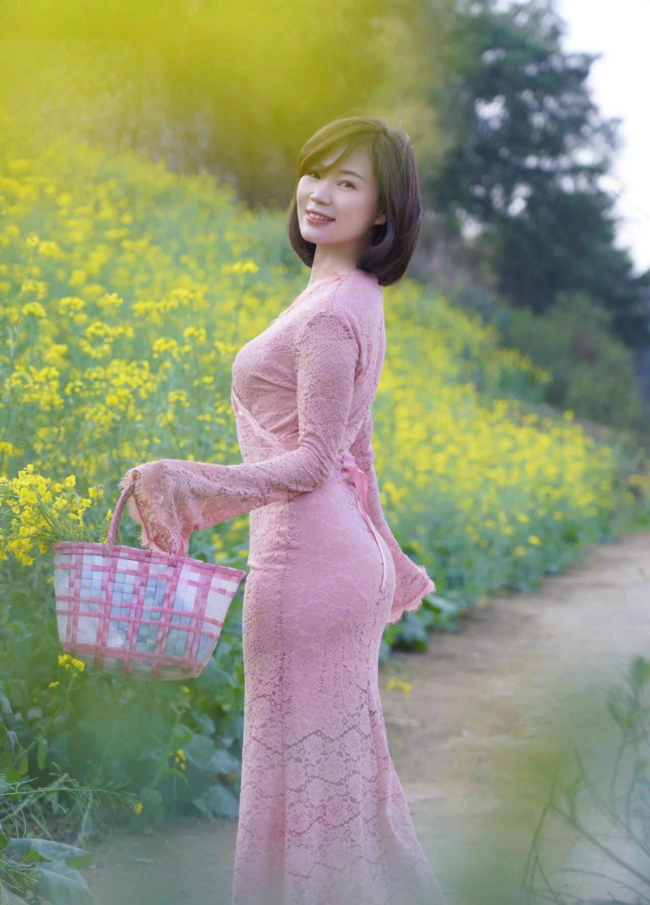 背景是一望无际的金色油菜花田,与澄澈的湖水相映成趣,绿意盎然的草木点缀其间,构成了一幅绝美的春日画卷。她时而手持花束静立水边,时而闭眼轻嗅花香,时而提着花篮漫步田间,时而静坐石上享受微风,每一个姿态都自然松弛,将春日的美好与女性的柔美展现得淋漓尽致,仿佛是从油画中走出的春日佳人,温柔又治愈。