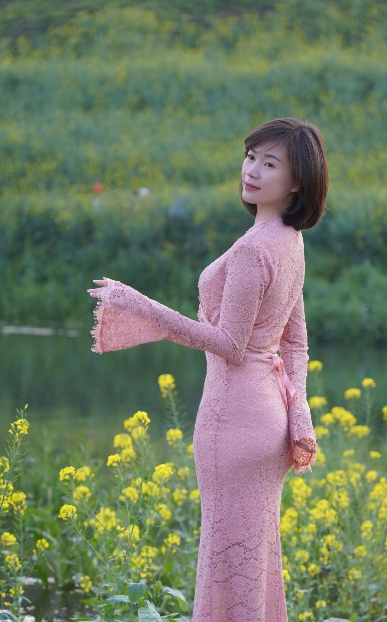 女子身着一袭温柔的粉色蕾丝长裙,精致的镂空花纹勾勒出曼妙身姿,喇叭袖设计灵动飘逸,尽显优雅气质。她留着一头利落的短发,眉眼温柔,笑容明媚,在花海中显得格外动人。