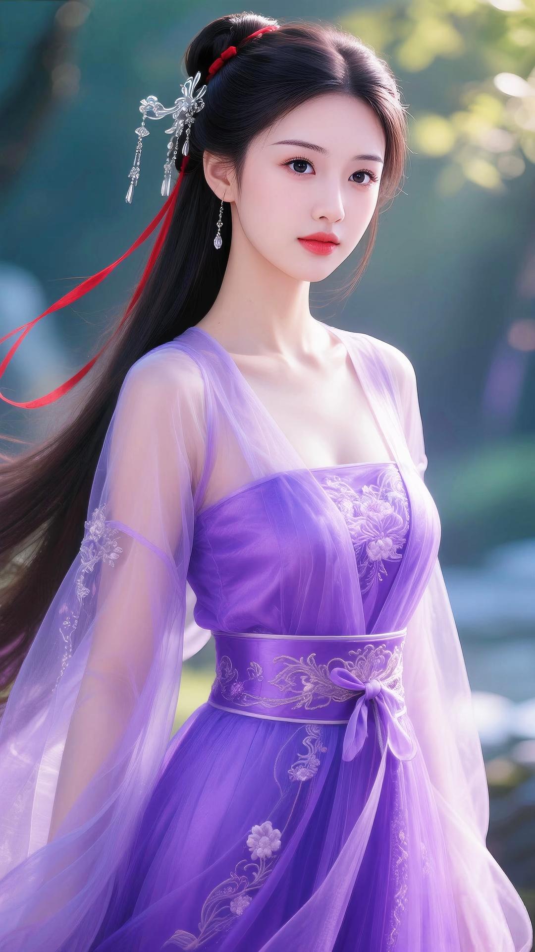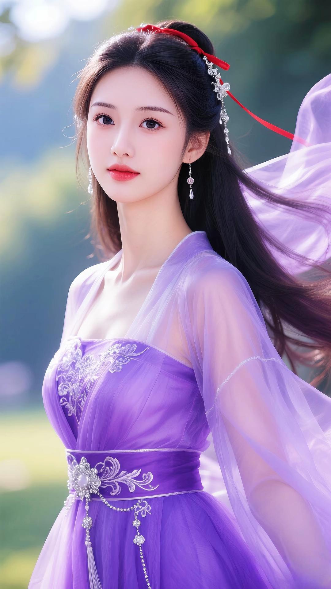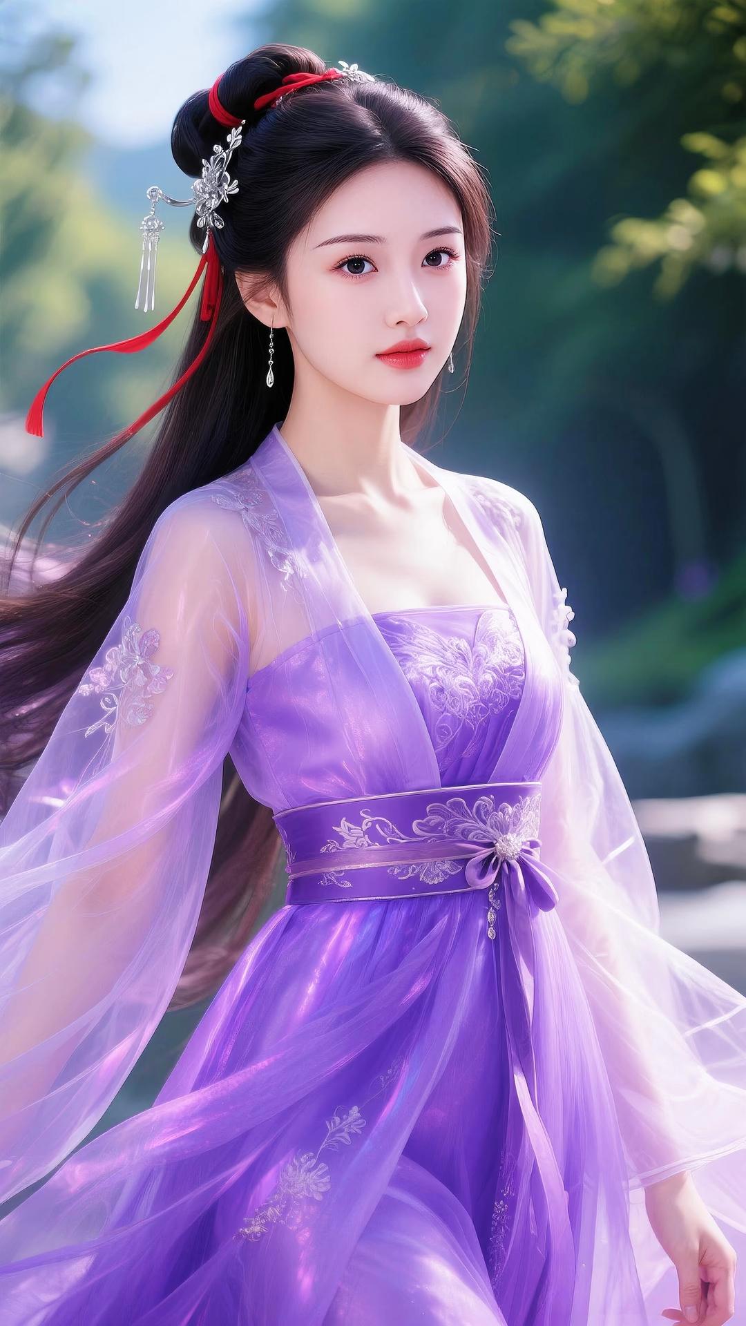 画面中的女子宛若误入凡尘的仙子,身着一袭梦幻紫渐变古风纱裙,外层薄纱轻盈飘逸,内层抹胸裙身绣着精致的银色花纹,腰间缀满珠翠流苏,行走间流光溢彩,仙气十足。一头乌黑长发高束成髻,点缀着银饰发簪与一抹红丝带,随风轻扬,眉眼如画,红唇娇艳,清冷中带着几分娇俏。