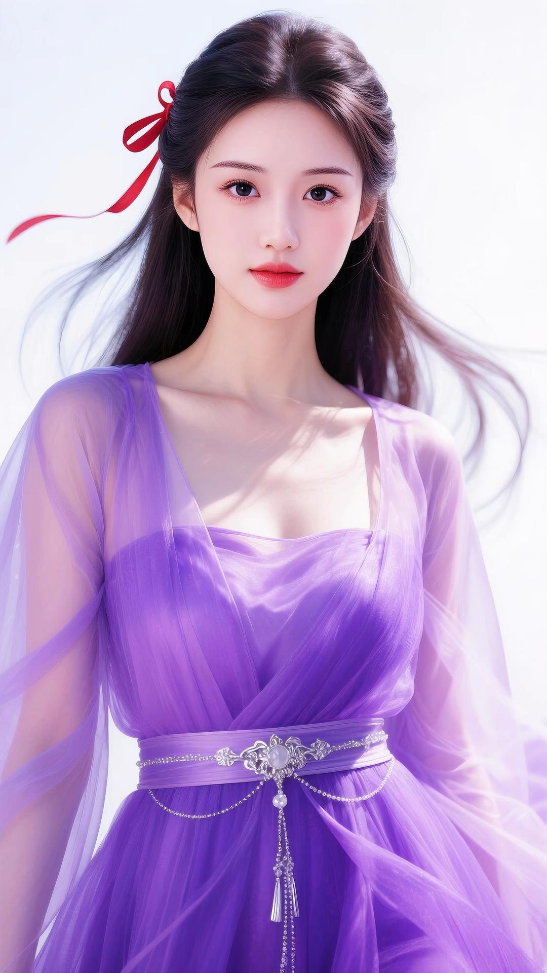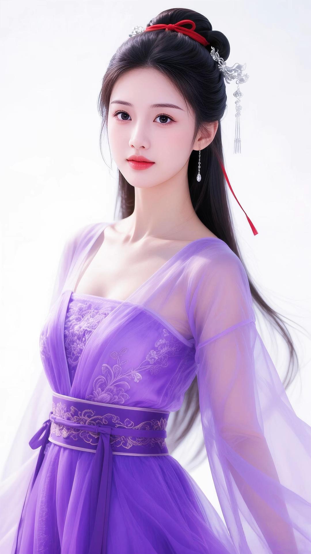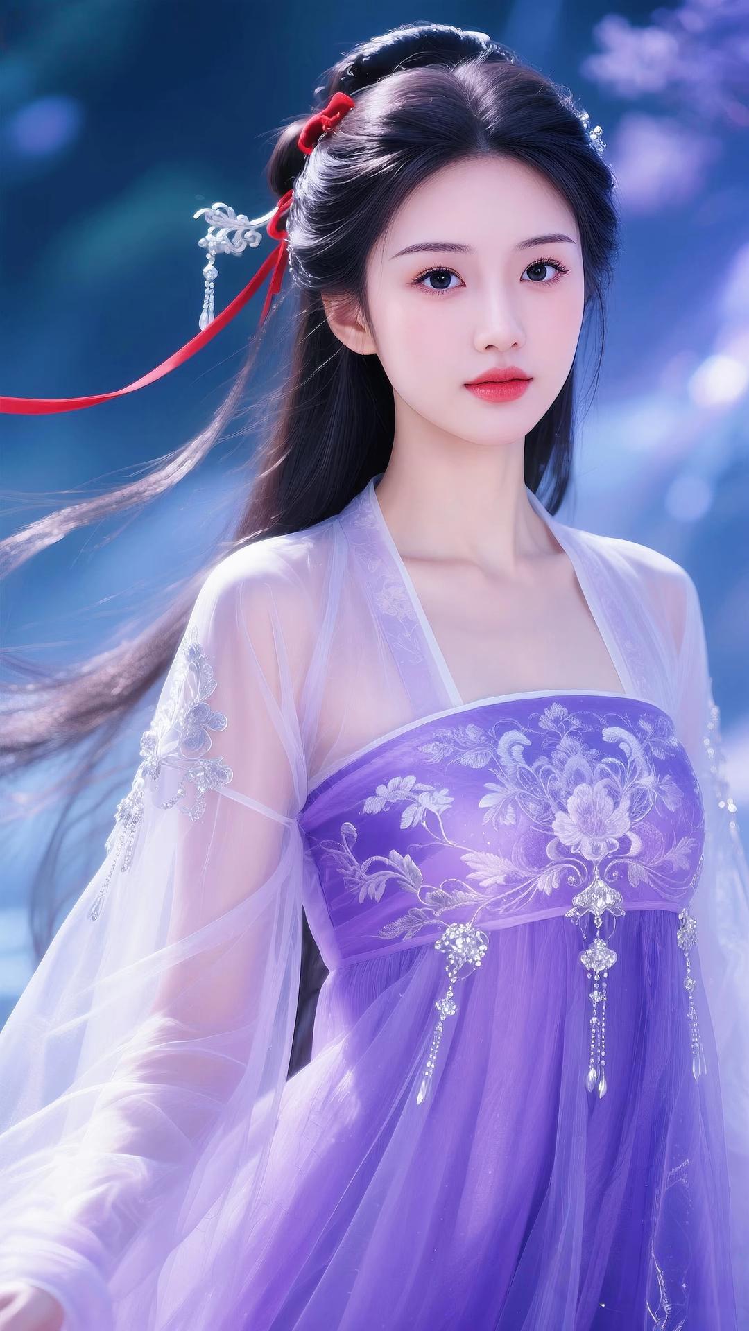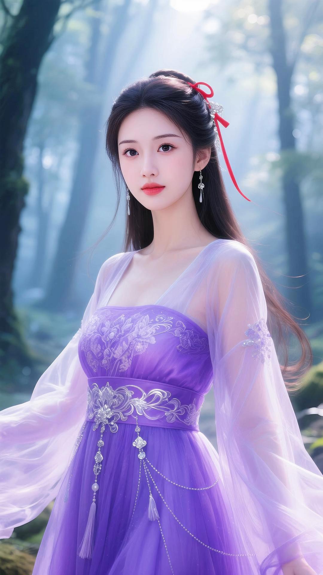 画面中的女子宛若误入凡尘的仙子,身着一袭梦幻紫渐变古风纱裙,外层薄纱轻盈飘逸,内层抹胸裙身绣着精致的银色花纹,腰间缀满珠翠流苏,行走间流光溢彩,仙气十足。一头乌黑长发高束成髻,点缀着银饰发簪与一抹红丝带,随风轻扬,眉眼如画,红唇娇艳,清冷中带着几分娇俏。