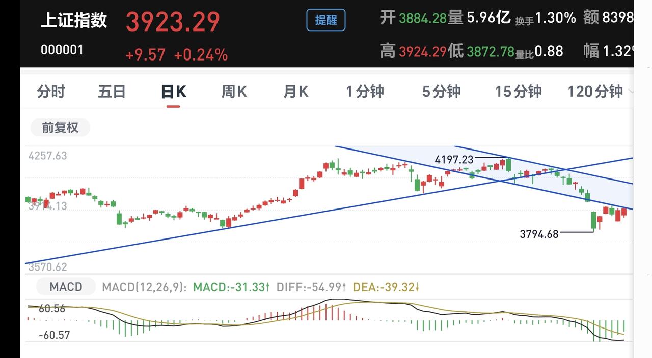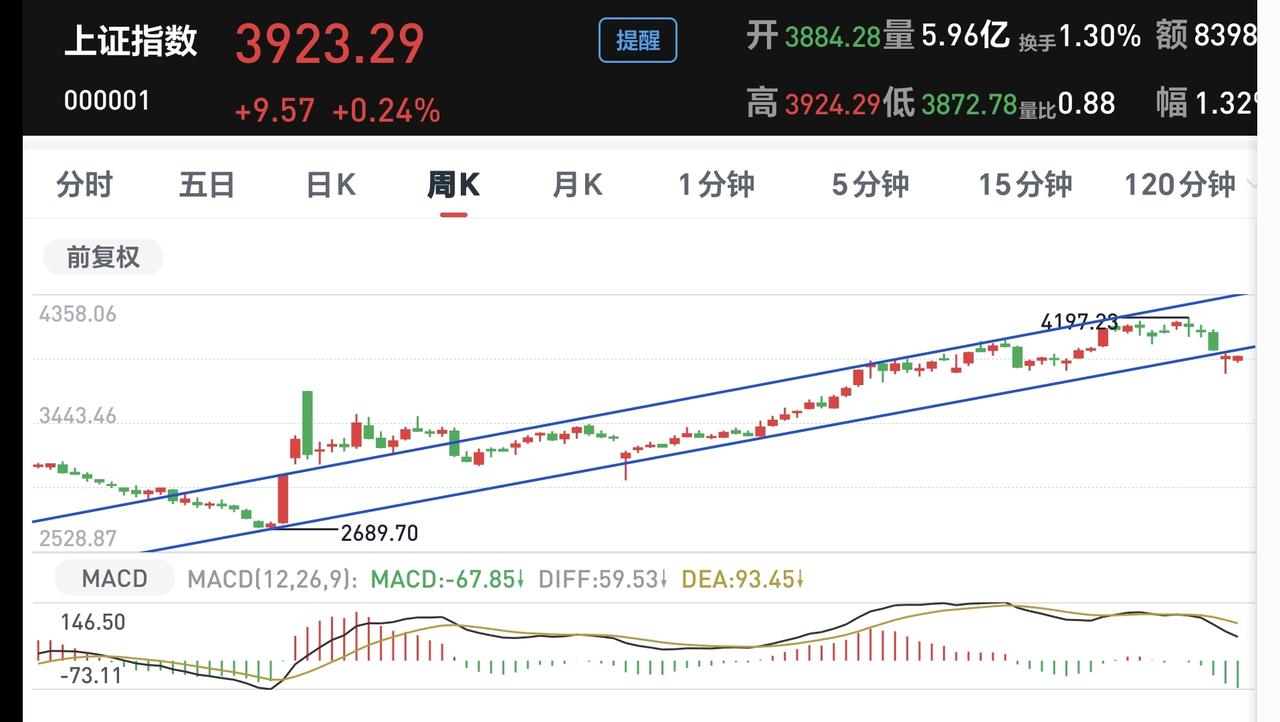 基金:反弹随时随地会结束 最近的几个交易日就是横盘震荡,上周一跳空低开大跌,留下了一个向下的跳空缺口,这个跳空缺口的上沿是3955点,到现在为止还没有能够全部回补。 上周一大跌以后,周二反弹,周三是跳空上涨,也留下了一个跳空缺口,但这个向上的跳空缺口已经被回补,周三的时候盘中上涨,最高到达了3937点,这也是从上周二反弹以来的最高点,天盘中最高3924点,并没有能够突破3937点,所以,现在是处于上周二开始的反弹过程中,还是处于上周三3937点以来的震荡调整中,还没有能够完全确定,但我认为现在大概率是处于上周二开始的反弹过程中,今天的盘中就有可能会突破3937点。 今天只有盘中突破了3937点,才能表明现在还处于上周二以来的反弹过程中,但突破3937点并不表明为强反弹,并不表明这样的反弹还有持续性,只有完全回补了上周一向下的跳空缺口,也就是上涨突破3955点,反弹才可以看高一线。 今天盘中注意两个点位,一个就是能不能上涨突破3937点,还有一个就是能不能上涨突破3955点,如果这两个点位都能突破,而且还有成交量配合,反弹就有可能还会持续,但如果只是上涨突破了3937点,并不能突破3955点,反弹的持续性就需要观察,但反弹会随时随地会结束。 看下面的截图2,这是上证指数日K线图,上证指数日线级别现在处于下跌趋势中,昨天的上涨并没有能够重新回到原来的下跌通道内,即使上涨回到了原来的下跌通道内,也还是处于下跌趋势中,只有上涨突破了这个下跌通道的上轨线,日线级别的下跌趋势才有可能被改变。 看下面的截图3,这是上证指数周K线图,上证指数上周下跌已经跌破了周线级别上涨通道的下轨线,本周是在这个上涨通道的下方震荡,近期观察会不会上涨重新回到原来的上涨通道内,只有上涨回到原来的上涨通道中,上证指数周线级别才有可能重新回到上涨趋势中。 昨天两市累计成交19159亿,成交量在20000亿以下,你想象一下,以这样的成交量能不能再创新高,这样的成交量太小了,这样的成交量都不支持继续上涨,这样的成交量根本不可能支持再创新高,所以,今天我们还是要继续观察成交量,特别是在上涨的过程当中,成交量能不能有效放大,成交量能够有效放大,就是有资金在进场,没有资金进场的上涨都是耍流氓,没有资金进场的上涨都是昙花一现,今天大概率会冲高回落。 大家帮忙评论点赞,转发和分享,谢谢大家的支持。