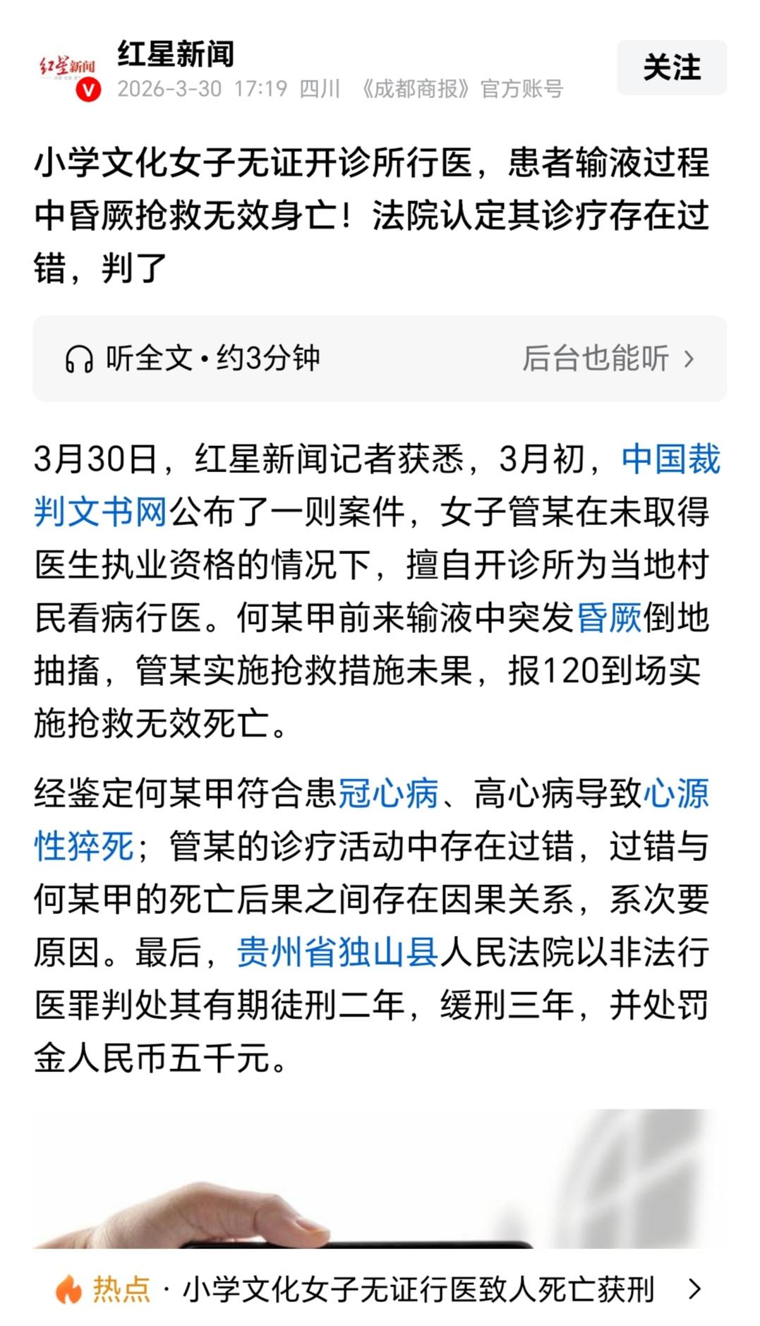 “这可真刑!”贵州独山,女子只有小学文化,没有取得医师执业资格,就擅自开诊所给乡亲们治病,没想到给患者输液时,患者突发晕厥抽搐,她尽力抢救,还是未能幸免于难。事后,鉴定机构认定患者属于心源性猝死,但女子的诊疗活动也存在一定过错,承担次要责任。女子主动赔偿患者家属11.8万元,结果还被法院判处有期徒刑两年,缓刑三年,并处罚金。 1975年出生的管某是个小学文化的农民,一辈子生活在独山的乡村里,没学过系统的医学知识,更没有取得过医师执业资格。 她爱好学医,但苦于没有条件,看着村里有些老人看病不方便,管某就琢磨着学点简单的打针输液,希望能减轻乡亲们的病痛,也能赚点补贴家用。 于是,管某便抱着侥幸心理,擅自在家开起了小诊所,平日里帮村里人看看小病、输输液。 因为一直也没出过什么大事,管某也渐渐放松了警惕,并没意识到无证行医是违法的事。 2024年7月13日下午1点多,村里的何某来到管某的小诊所看病。 何某本身就有哮喘、冠心病这些基础病,身体一直不太好,这次来找管某,就是想输点液缓解不适。 管某没多想,也没仔细评估何某的身体状况,就按照自己的经验,先后给何某输了头孢呋辛纳、利巴韦林、左氧氟沙星这三种药液,每种药都配了100毫升。 一开始输液还算顺利,可等到输左氧氟沙星的时候,何某突然脸色变差,说身体很不舒服。 管某一下子慌了神,赶紧给何某甲拔掉针头。 可刚拔完针,何某就突然昏厥在地,还不停抽搐。 看着眼前的场景,管某知道事情闹大了,只能凭着自己仅有的一点常识,赶紧掐何某的人中、掐虎口,还想喂水给他,手忙脚乱地尝试着抢救。 可不管她怎么做,何某的情况都没有丝毫好转。 慌乱之下,管某赶紧拨打了120急救电话,等120医护人员赶到现场,经过一番紧急抢救,还是没能挽回何某的生命,人最终还是不幸离世了。 此时管某吓得六神无主,知道自己闯了大祸,在得知何某的家属已经报警后,她没有逃跑,而是留在现场等着警方过来。 管某心里满是懊悔,一直自责着:要是没有擅自开诊所,就不会闹出人命。 案发后,管某主动到案,把她无证行医、给何某输液的全过程如实说了出来。 经过专业鉴定机构鉴定,何某甲本身患有冠心病、高心病,最终是因心源性猝死,自身原因占主要过错责任。 但是管某没有行医资格,违规开展诊疗活动,存在明显过错,这和何某的死亡有一定因果关系,因此,管某需要承担次要责任。 为了弥补过错,她还积极和何某的家属沟通,尽她所能赔偿了11.8万元,取得了家属的谅解。 尽管如此,案件还是被提起公诉,移交到法院审理。 《刑法》第336条规定:未取得医生执业资格的人非法行医,情节严重的,处三年以下有期徒刑、拘役或者管制,并处或者单处罚金;……造成就诊人死亡的,处十年以上有期徒刑,并处罚金。 管某没有行医资质,却对有基础病患者违规输液,存在诊疗过错,与死亡有次要因果关系,属于情节严重。 虽然死亡的主因是患者心源性猝死,但非法行医行为违法性独立,不能免除刑责。 法院审理认为,管某未取得医生执业资格就非法行医,造成患者死亡,情节严重,已经构成非法行医罪。 管某明知家属报警仍等候、如实供述,构成自首;积极赔偿11.8万元并获谅解、认罪认罚,依法从轻或者减轻处罚。 最终,管某被判处有期徒刑二年,缓刑三年,同时处罚金五千元。 管某也许是一片好心,但行医必须有正规资质,哪怕是想帮人,没有专业资格和合法手续,擅自行医不仅会危及他人生命,自己也会触犯法律,付出沉重的代价。