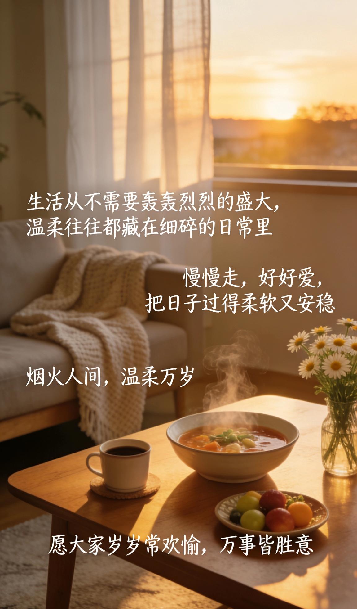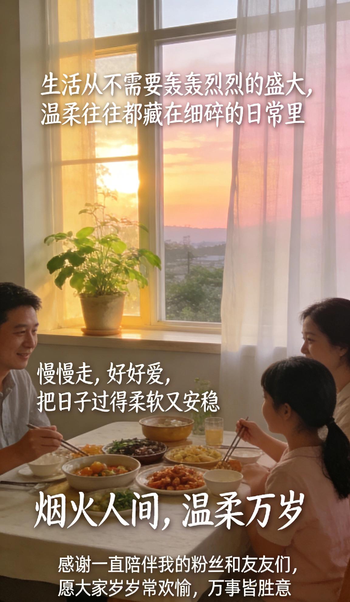 生活从不需要轰轰烈烈的盛大,温柔往往都藏在细碎的日常里。清晨的一缕暖阳,傍晚的一阵清风,一碗热乎的饭菜,一句轻声的问候,都在悄悄治愈着平凡的日子。 不必追赶时光,不必焦虑前路,慢慢走,好好爱,把日子过得柔软又安稳。用心接住每一份不期而遇的小美好,认真对待三餐四季,生活自会回赠你温柔与光亮。 烟火人间,温柔万岁,愿我们都能在平淡里寻得欢喜,在琐碎中守住心安。感谢一直陪伴我的粉丝和友友们,愿大家岁岁常欢愉,万事皆胜意。