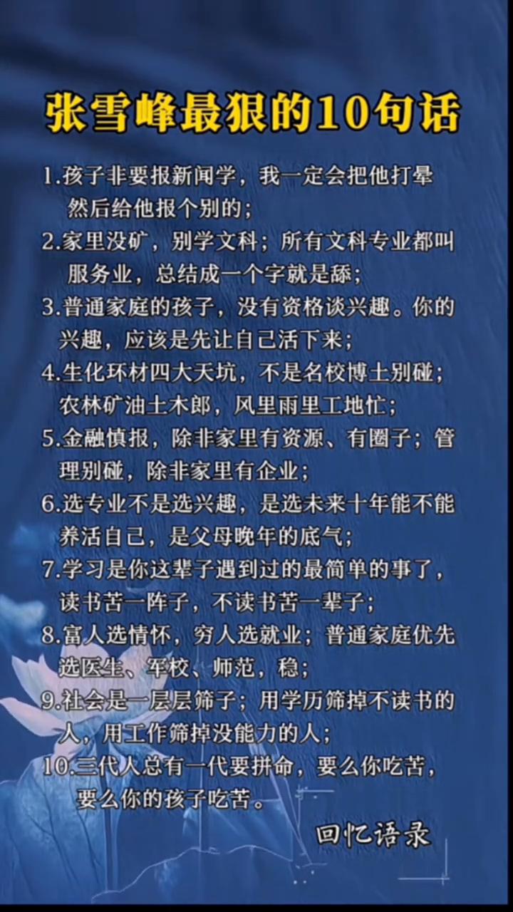 张雪峰最狠的10句话。 ·1.孩子非要报新闻学,我一定会把他打晕,然后给他报个别的。 ·2.家里没矿,别学文科;所有文科专业都叫服务业,总结成一个字就是舔。 ·3.普通家庭的孩子,没有资格谈兴趣。你的兴趣,应该是先让自己活下来。 ·4.生化环材四大天坑,不是名校博土别碰;农林矿油土木郎,风里雨里工地忙。 ·5.金融慎报,除非家里有资源、有圈子;管理别碰,除非家里有企业。 ·6.选专业不是选兴趣,是选未来十年能不能养活自己,是父母晚年的底气。 ·7.学习是你这辈子遇到过的最简单的事了,读书苦一阵子,不读书苦一辈子。 ·8.富人选情怀,穷人选就业;普通家庭优先选医生、军校、师范,稳。 ·9.社会是一层层筛子;用学历筛掉不读书的人,用工作筛掉没能力的人。 ·10.三代人总有一代要拼命,要么你吃苦,要么你的孩子吃苦。