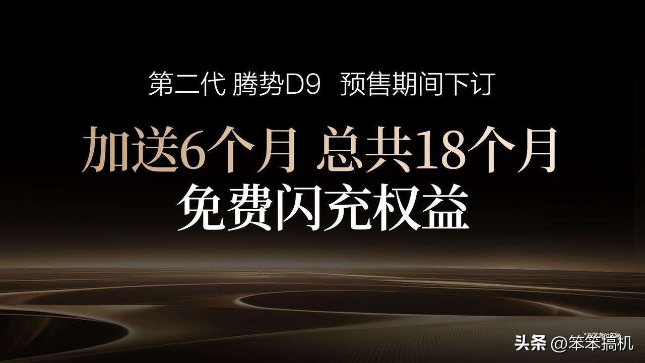 智能化方面,全系标配天神之眼5.0,开得稳、停得准,比老司机还靠谱。预售期送18个月免费闪充权益,超划算。腾势D9连续三年蝉联MPV销冠,全球首款30万辆新能源MPV,这次换代里里外外都升级,商务有排场、家用有温度,你们觉得怎么样呢?