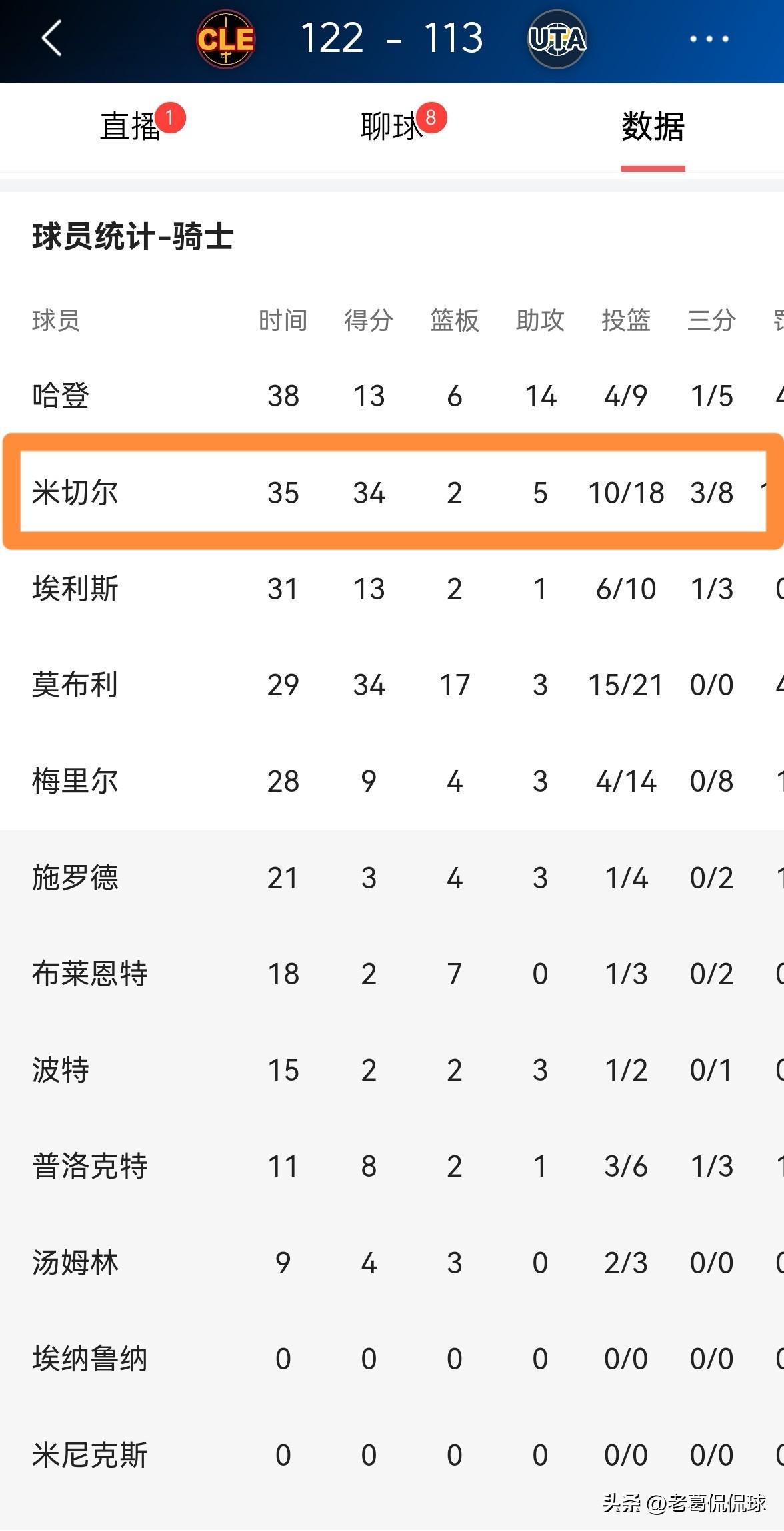 骑士当家球星米切尔真是大显神威呀!在今天骑士客场以122:113击败爵士的比赛中,火力全开的米切尔在进攻端大显神威砍下34分,成为了球队赢球的最大功臣。 整场比赛下来,米切尔首发出战35分钟,投篮18中10,其中三分球8中3、罚球12中11相当高效的砍下34分,外加2篮板5助攻1抢断,他的场上正负值为+11。 米切尔不愧是当今联盟最出色的得分手之一,米切尔和哈登的组合真是相得益彰,米切尔专注于得分,而哈登专注于组织串联。