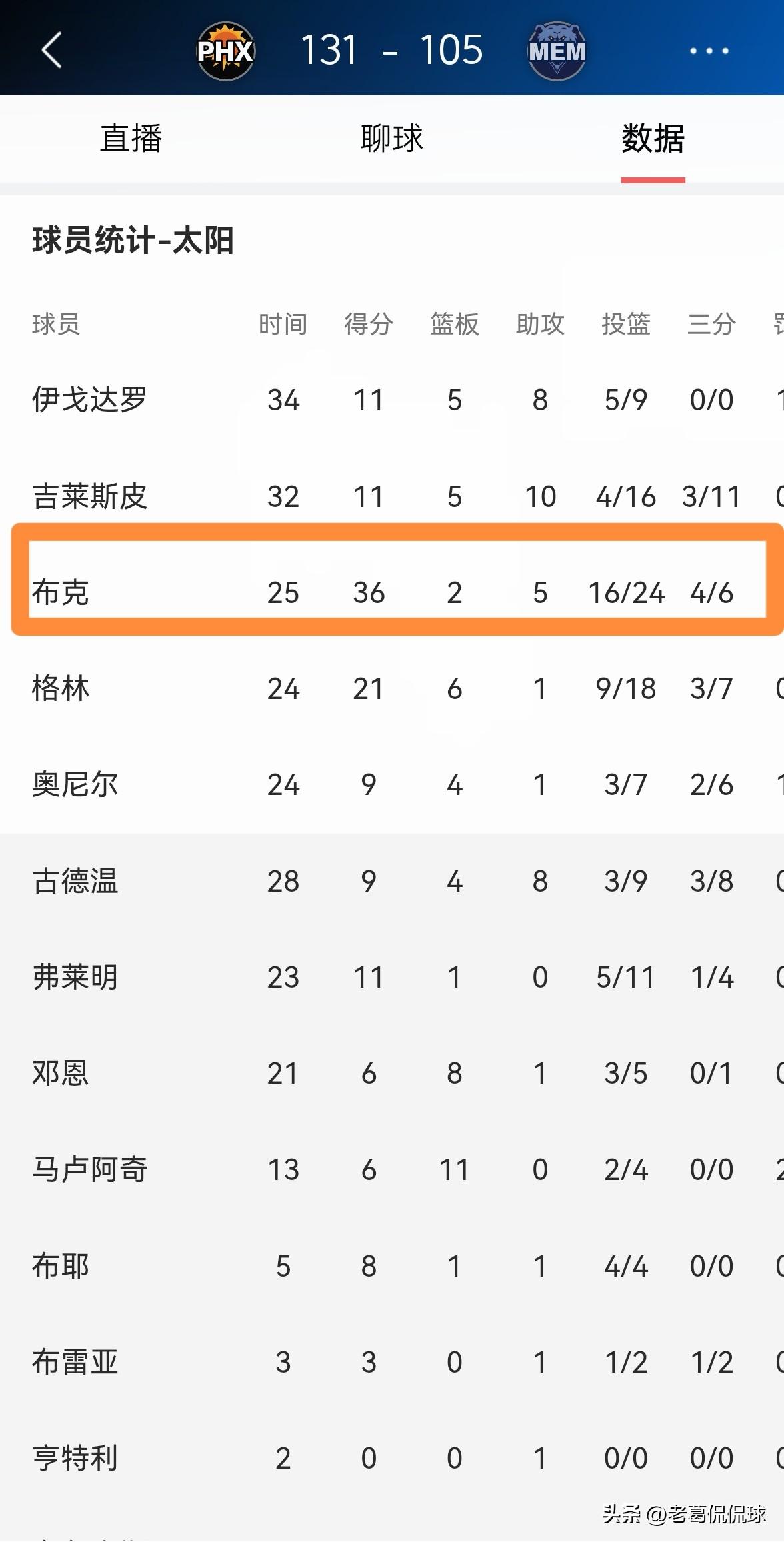 太阳巨星布克真是名副其实的虐菜高手!在今天太阳客场以131:105大胜弱旅灰熊的比赛中,布克在灰熊的身上狂刷36分。 全场比赛下来,布克首发出战25分钟,投篮24中16,其中三分球6中4爆砍36分,还有2篮板5助攻,他的场上正负值为+5。 实事求是的说,每当太阳遇到联盟的弱旅时,布克的进攻效率就会高的吓人,而且布克的眼里只有篮筐。