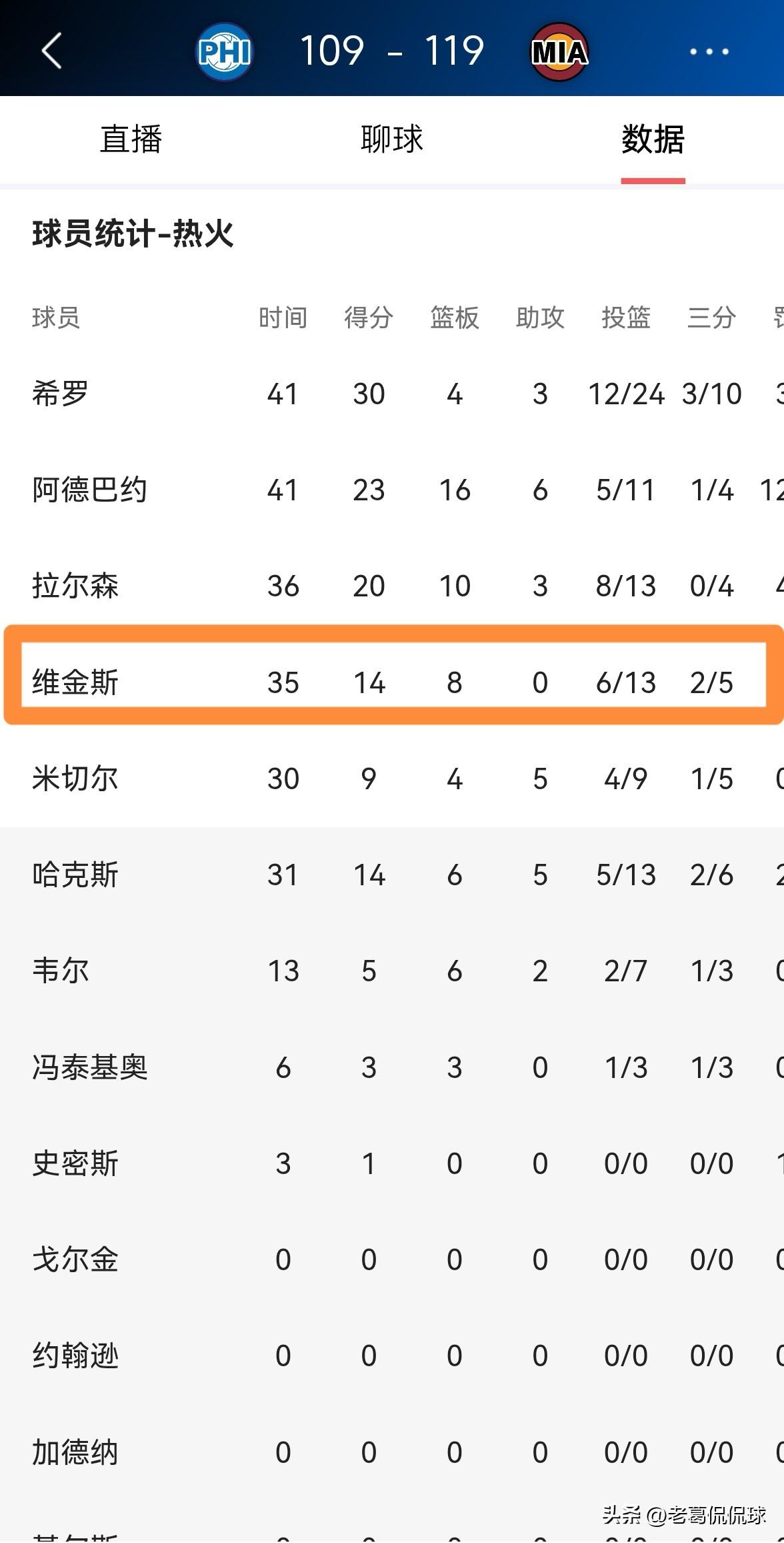 热火球星维金斯真是一名能攻善守的好球员!在今天热火主场以119:109力克76人的比赛中,维金斯在攻防两端都打出了非常精彩的表现,展现出了攻防一体的能力。 整场比赛下来,维金斯首发出战35分钟,投篮13中6,其中三分球5中2得到14分8篮板3抢断2盖帽,他的场上正负值为+5。 坦白说,作为热火阵中防守能力最强的球员之一,维金斯每场比赛都肩负着防守对方核心球员的重担,即便如此维金斯依然能够在进攻端打出不错的表现,像维金斯这种攻防一体的球员活该吃香。