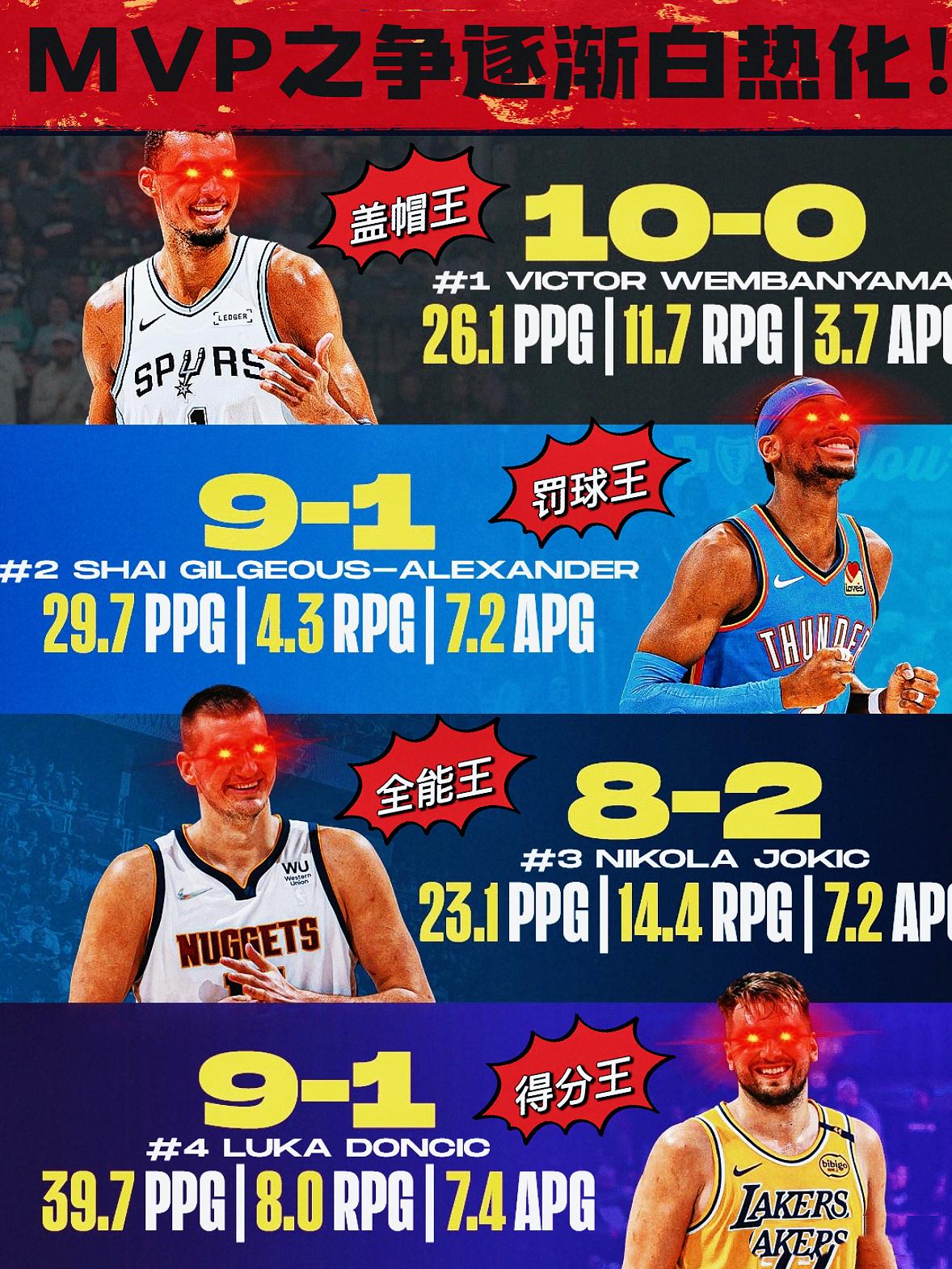 MVP之争逐渐白热化!四人谁将脱颖而出? 随着常规赛临近结束,几大MVP热门人也纷纷开始发力,盖帽王文班亚马、全能王约基奇、罚球王亚历山大以及得分王东契奇四人在近期均打出现象级表现,这使得原本没啥悬念的常规赛MVP瞬间变得悬念四起,下面我们就来看看他们近期到底有多么出色! 在最近的10场比赛中,马刺取得了10胜0负的佳绩,大有一鼓作气追上雷霆拿下联盟第一的架势!在此期间,马刺当家球星文班亚马场均可以拿下26.1分11.7篮板3.7助攻3封盖的恐怖数据!假若马刺最终排名能够反超雷霆,那文班亚马很有可能一鼓作气将最佳防守球员以及常规赛MVP双双拿下,迎来大丰收! 在打破张伯伦连续20+得分纪录之后,亚历山大并未停止前进的脚步,他在近10场比赛中场均能够拿下29.7分4.3篮板7.1助攻的数据,率领雷霆取得9胜1负的佳绩,继续稳坐联盟第一!如今亚历山大唯一的劣势就是去年已经拿下过MVP,媒体难免会审美疲劳。但综合球队战绩以及个人表现来看,亚历山大依旧是今年MVP的最热门人选! 自打与女友分手之后,东契奇像是解除封印般一发不可收拾,在最近的10场比赛中,东契奇场均能够轰下39.7分8篮板7.4助攻,率领湖人取得9胜1负的佳绩,一举超越掘金、火箭排名升至西部第三!这也让他迅速成为MVP的热门人选之一,若是能将此状态保持到赛季末,那在洛杉矶媒体的造势下,东契奇极有可能成为黑马! 同是欧洲出身的约基奇近来表现亦是亮点十足,在最近10场比赛中,约老师多次拿下三双数据,场均23.1分14.4篮板7.2助攻的数据尽显其全能身手!在其带领下,掘金近期取得了8胜2负的佳绩,死死咬住湖人排在西部第四!不过与前面三人相比,已经拿过2次常规赛MVP的约老师今年再拿的机会已然十分渺茫! 亚历山大第一、文班亚马第二、东契奇第三!这么排应该没太大争议吧?