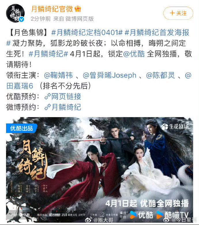 月鳞绮纪有四个一番郭敬明导演的新剧《月鳞绮纪》终于要来了,这部剧定档在愚人节,从阵容到主演颜值,在内娱也是顶级阵容。不过粉丝的心现在可以放下来了吧,看来鞠婧祎和丝芭也要和解了,那就坐等追剧吧!月鳞绮纪在愚人节播