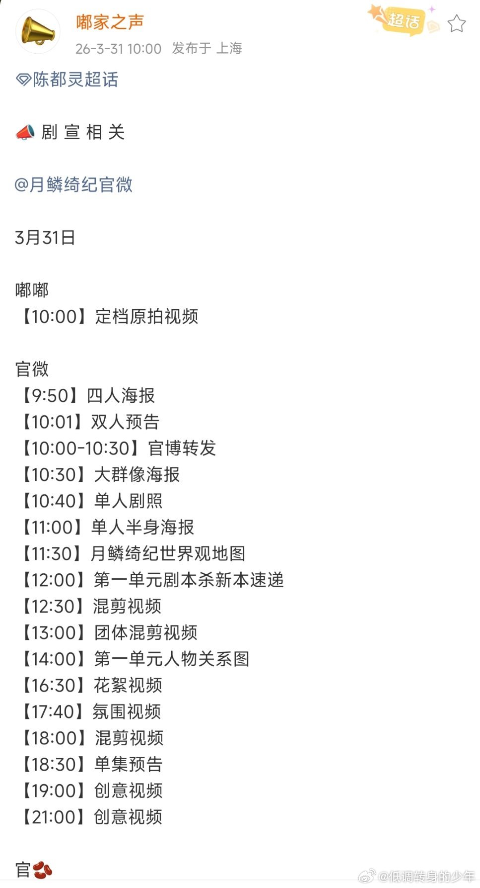 看陈都灵月鳞绮纪定档宣发节奏~今天物料好多,这么匆忙的空降,陈都灵月鳞绮纪 会不会一次性直接全播出来! 全播比播不了强啊