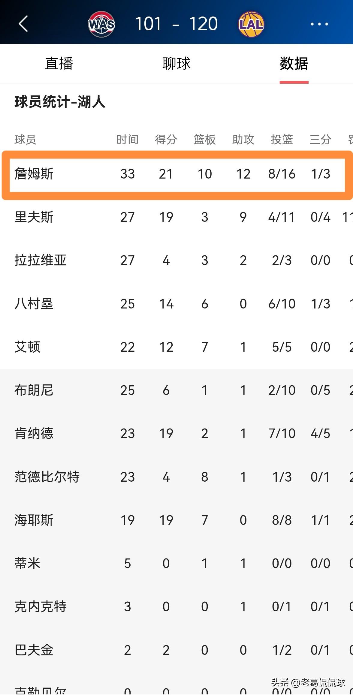 湖人官方真是太懂人情世故了!在今天湖人主场以120:101轻取奇才的比赛中,41岁的詹姆斯再次豪取三双砍下21分10篮板12助攻,成为了球队获胜的最大功臣。值得一提的是,在比赛结束以后,湖人官方特意更新社媒,晒出了一张詹姆斯本场比赛的数据海报,以此来感谢詹姆斯为球队做出的巨大贡献。 不得不说,湖人官方实在是太懂人情世故了,湖人官方这样做一定会让詹姆斯倍受鼓舞。