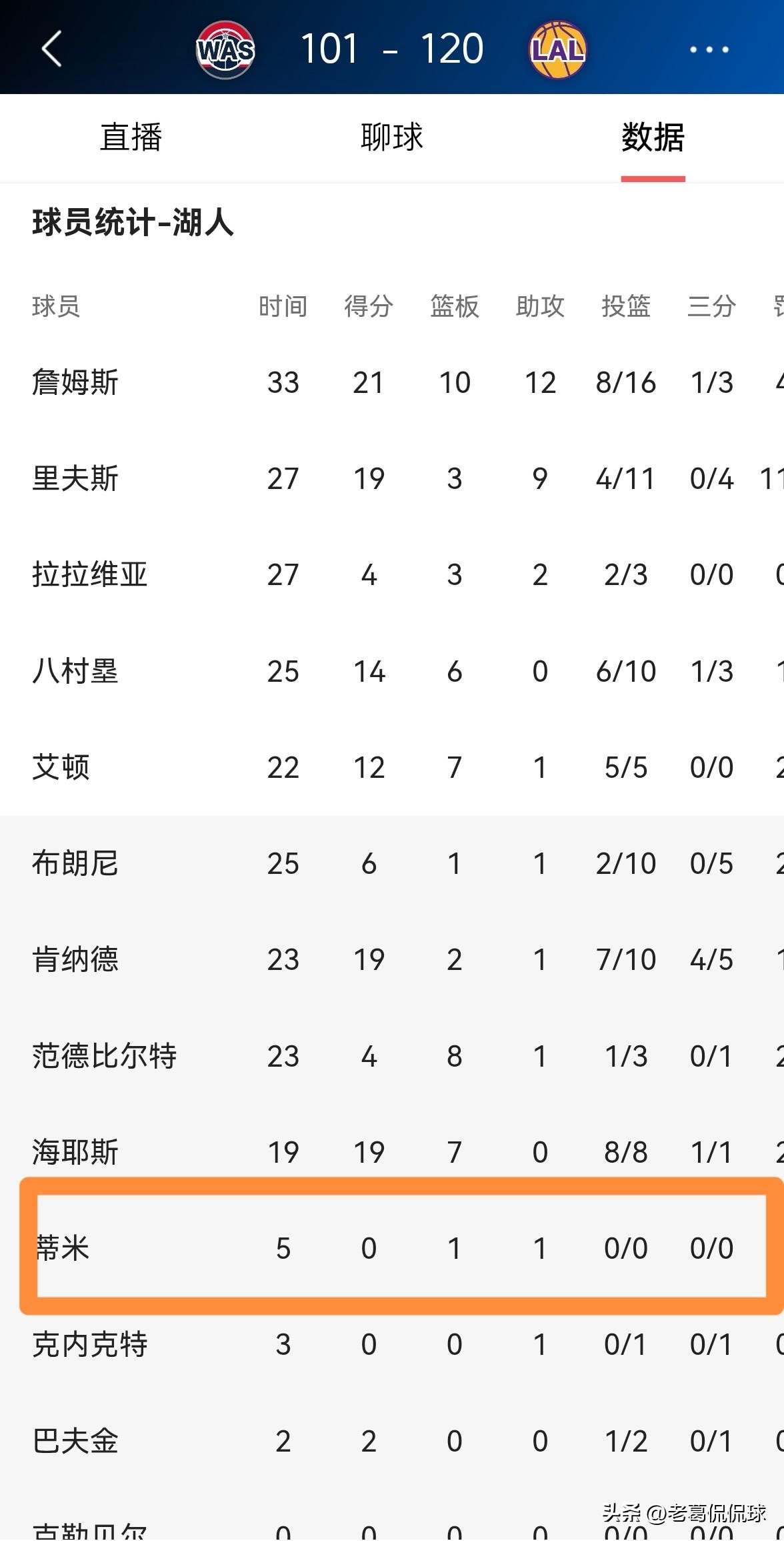 湖人大将蒂米真是毫无得分欲望!尽管今天湖人在主场以120:101轻取奇才,但是蒂米在替补登场以后却毫无得分欲望,他是湖人上场球员中唯一没有出手的球员。 全场比赛下来,蒂米替补出战5分钟,没有出手怒砍0分,不过有1篮板1助攻,他的场上正负值为-8。 老实说,如果蒂米在难得的上场时间里不主动表现自己的话,那么蒂米距离离开湖人肯定越来越近了。