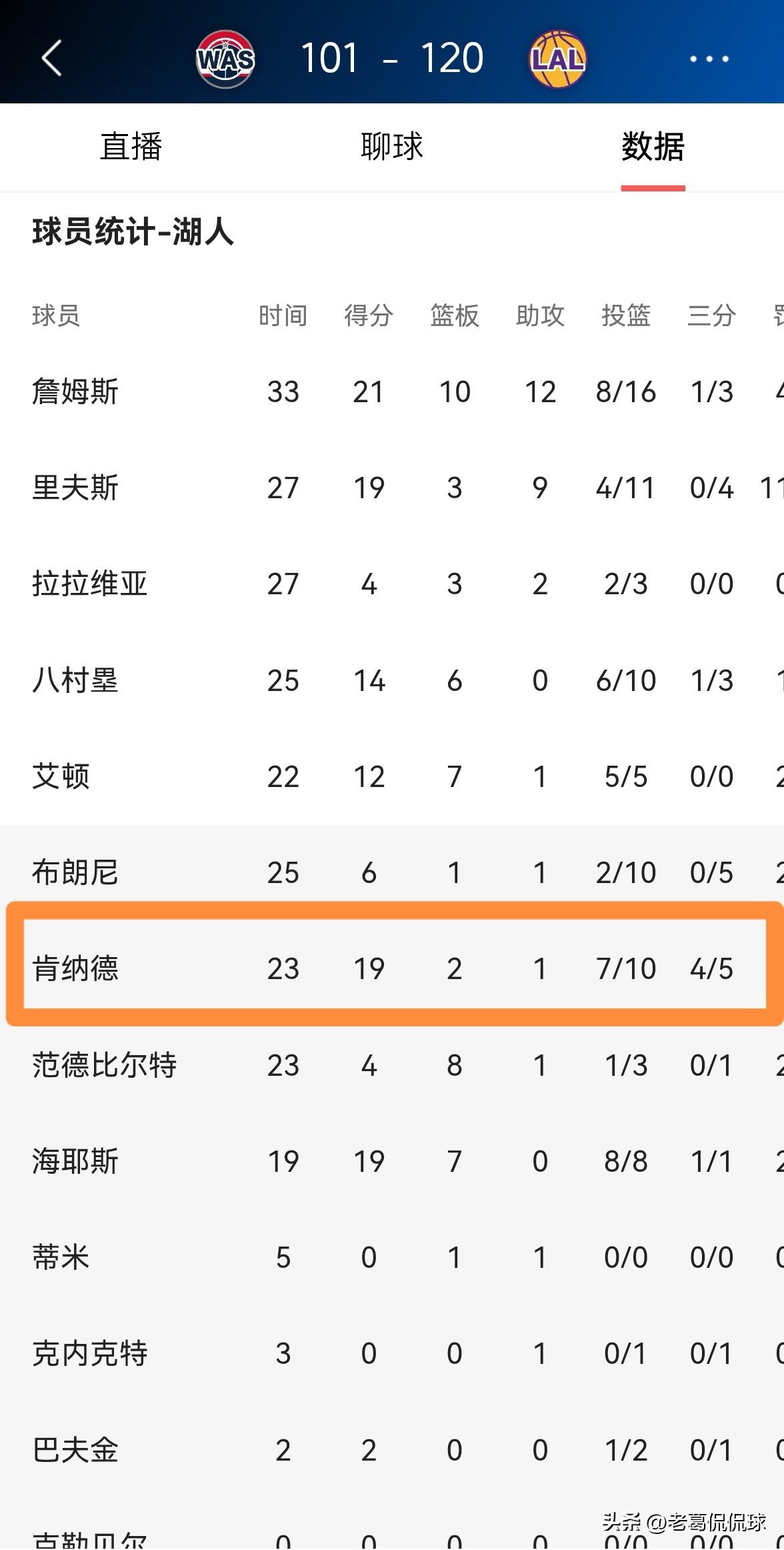 湖人神射手肯纳德真是大放异彩!在今天湖人主场以120:101大胜奇才的比赛中,手感滚烫的肯纳德将自己神射手的风采展现的淋漓尽致,他在三分线外简直是弹无虚发。 全场比赛下来,肯纳德替补出战23分钟,投篮10中7,其中三分球5中4、罚球1中1非常高效的砍下19分,还有2篮板1助攻1抢断,他的场上正负值为+20。 坦白说,假如肯纳德能够在接下来的比赛中场场爆发的话,那么湖人何愁不能夺冠呢?