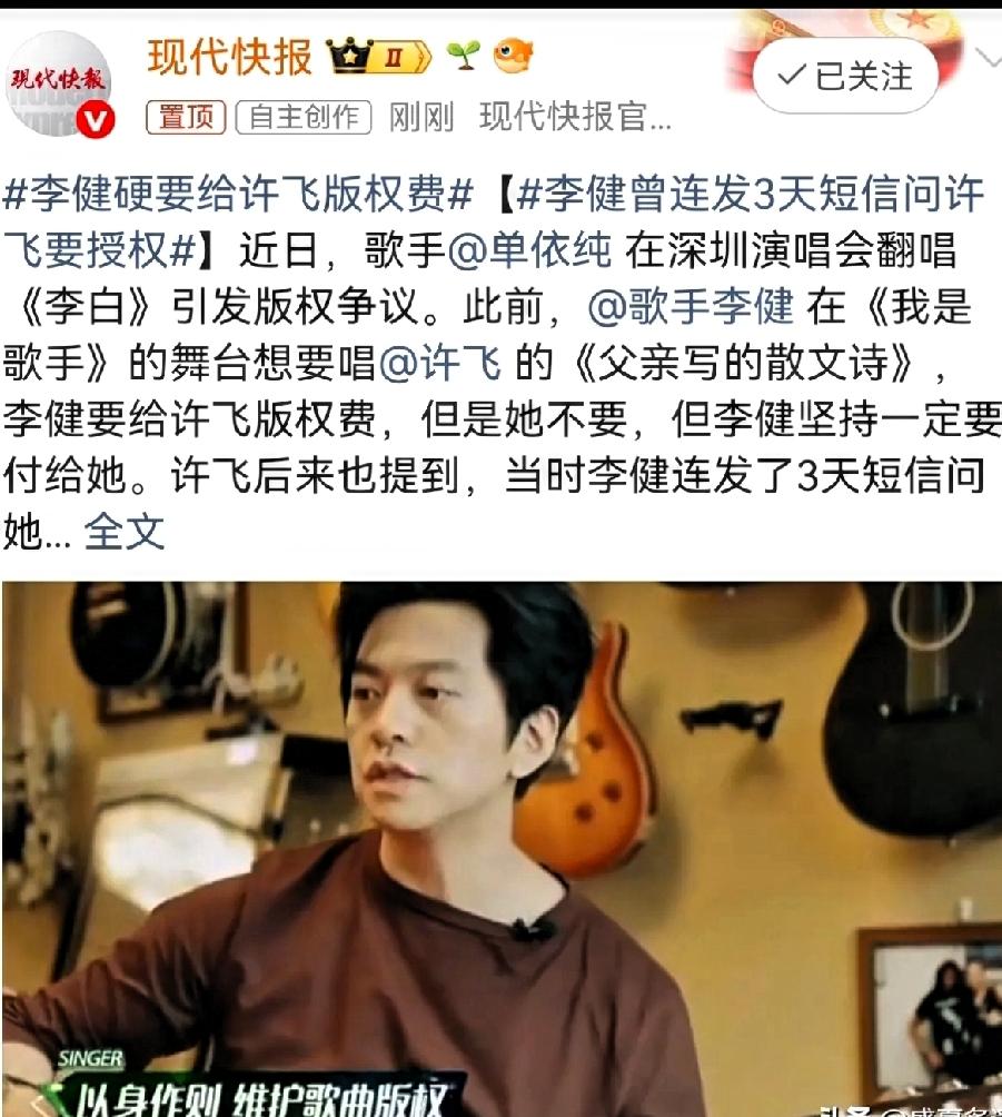 李健这波操作真的很圈粉! 3月30日晚上,一向低调的歌手李健,突然冲上了热搜, 原来,根据此次单依纯的版权之争,网友扒出了李健当年翻唱许飞《父亲写的散文诗》时的“教科书式操作”。李健为了要授权,连续3天给她发短信,她没看到,李健还换平台联系,就为了把这事儿办妥。 他不光提前给许飞打电话征得同意,还坚持要付版权费,哪怕许飞说不要,他也硬要给。听说李健每次翻唱原作品都事先联系原创作者,得到同意才翻唱,这态度确实让人敬佩。他觉得作曲人和创作人就该得到尊重。 一件是硬给版权费,一件是硬翻唱惹争议,大家觉得谁更圈粉呢?