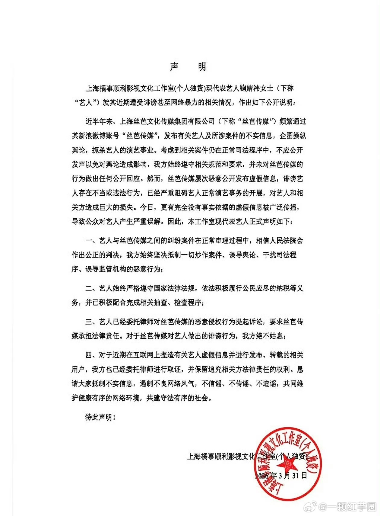 鞠婧祎工作室声明🈶!