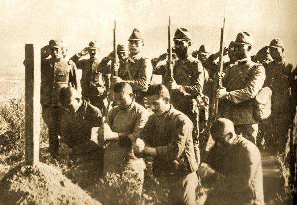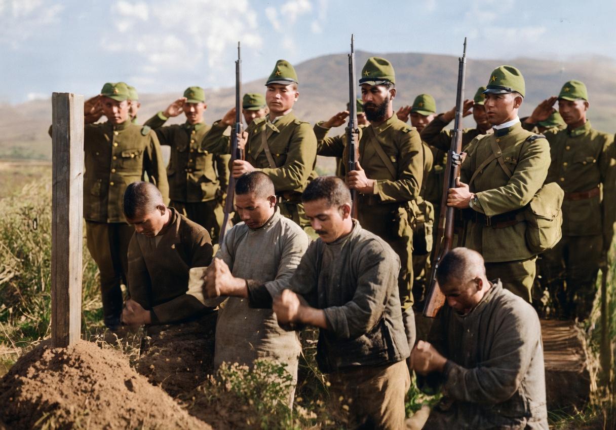 抗日战争时期,四位被绑住双手的中国战俘,正低头合掌,对着一座简陋的土墓虔诚祭奠,持枪的日军士兵环立四周,部分士兵甚至抬手敬礼——这种“礼貌”的姿态,更像是侵略者对中国军人的傲慢“致意”。下方文字标注:“在日军修起的中国无名战士墓前合掌的中国战俘”。 日军为牺牲的中国战士修墓,并非出于怜悯,更可能是一种政治宣传手段——试图粉饰侵略暴行,而他们在旁的监视“敬礼”,则彻底撕下了“文明”的伪装,暴露了强权的本质。