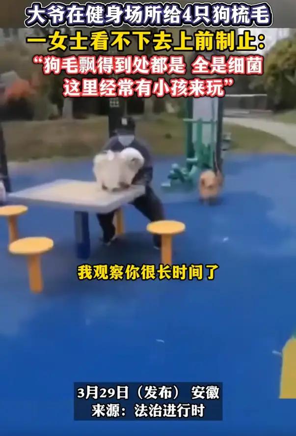 安徽,一位大妈去公园溜达,看到一位大爷在健身场所给狗梳毛,女子越看越觉得不妥,当场上前劝阻:我们年纪大了无所谓,但要为下一辈考虑啊,人和畜 生还是要分得清的!此话一出网友也是纷纷点赞。 事发当天,一位大妈闲来无事到公园散步,走到公共健身区域时,眼前的景象让她心生不悦。只见一位大爷正坐在健身器材旁,将自家狗狗放在公共健身台面上,专心致志地给狗狗梳理毛发,细密的狗毛随风飘散,落在健身器材、座椅和地面上。 这片健身区是周边居民,尤其是老人和孩子日常休闲锻炼的主要场所,孩童们常常会在这里摸爬玩耍,卫生状况至关重要。大妈看着大爷的行为,越想越觉得不妥,公共区域绝非私人场所,这样的做法既不文明,也存在健康隐患。于是她主动上前,语气诚恳又坚定地劝阻:“我们年纪大了无所谓,但要为下一辈考虑啊,人和狗狗还是要分得清的!” 视频曝光后,网友们几乎一边倒地支持这位大妈,纷纷留言称赞她明事理、有担当。大家表示,养宠是个人自由,但绝不能以牺牲公共环境和他人权益为代价,文明养宠重在守规矩、有边界,只有每个人都守住公共文明的底线,才能让生活环境更舒心、更和谐。