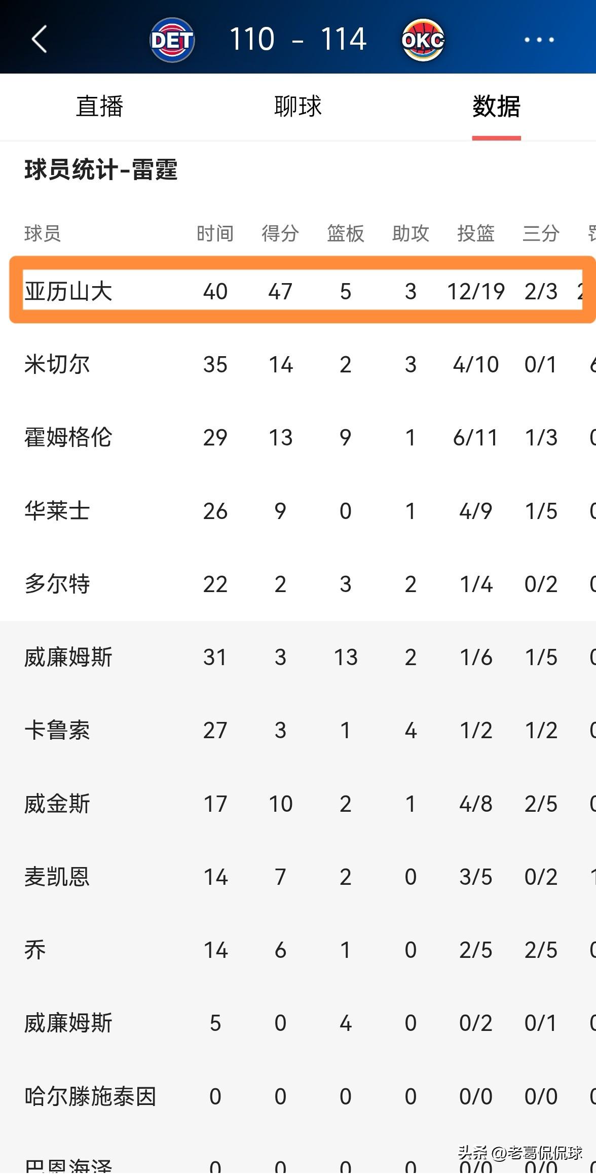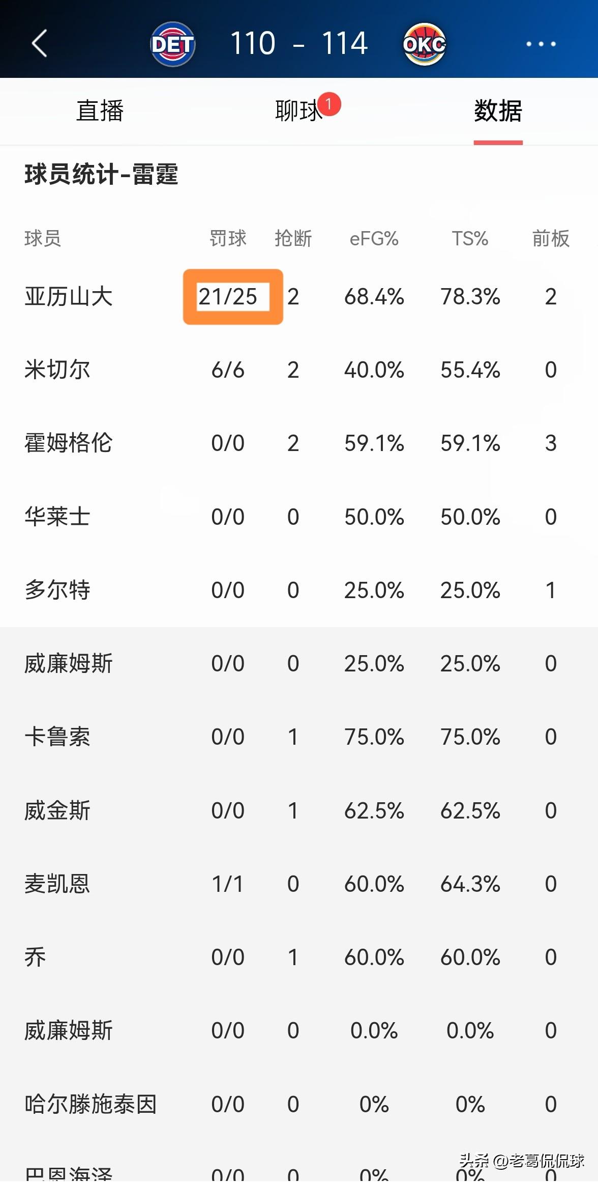 雷霆巨星亚历山大的罚球数真是令人惊讶!在今天雷霆主场以114:110险胜活塞的比赛中,亚历山大获得了不可思议的25次罚球,作为对比,本场比赛活塞全队的罚球数为23次,亚历山大的罚球数真是多到令人惊讶。 全场比赛下来,亚历山大首发出战40分钟,投篮19中12,其中三分球3中2、罚球25中21狂轰47分,外加5篮板3助攻2抢断,他的场上正负值为+8。 我相信对于亚历山大在本场比赛中的罚球数,大家一定有很多话要说,请大家在评论区畅所欲言!!!