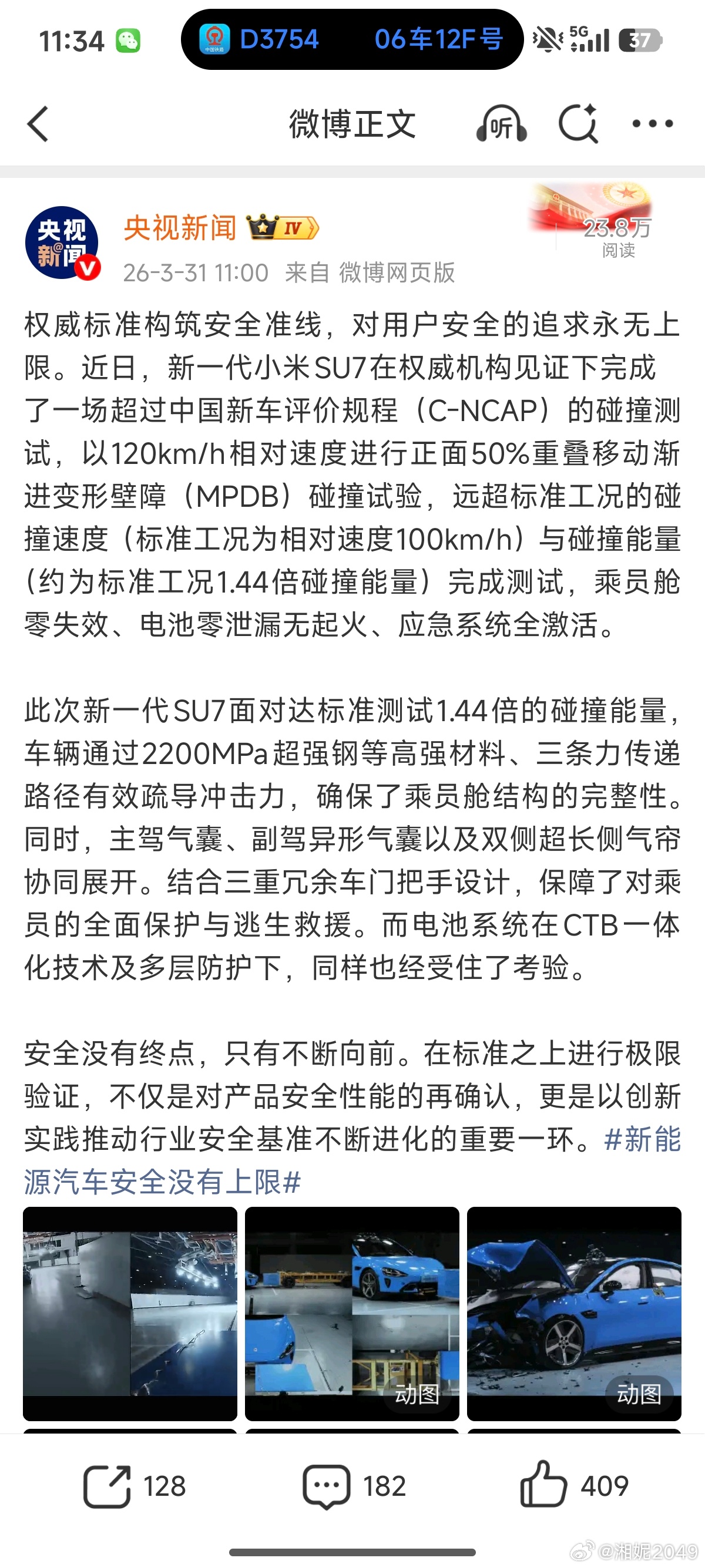 新能源汽车安全没有上限这两年的趋势很明显了,电动车安全这一块国家都下场关注了。这次更加是公开认可小米,新SU7安全这块的真材实料毋容置疑了,黑子们可以闭嘴了。