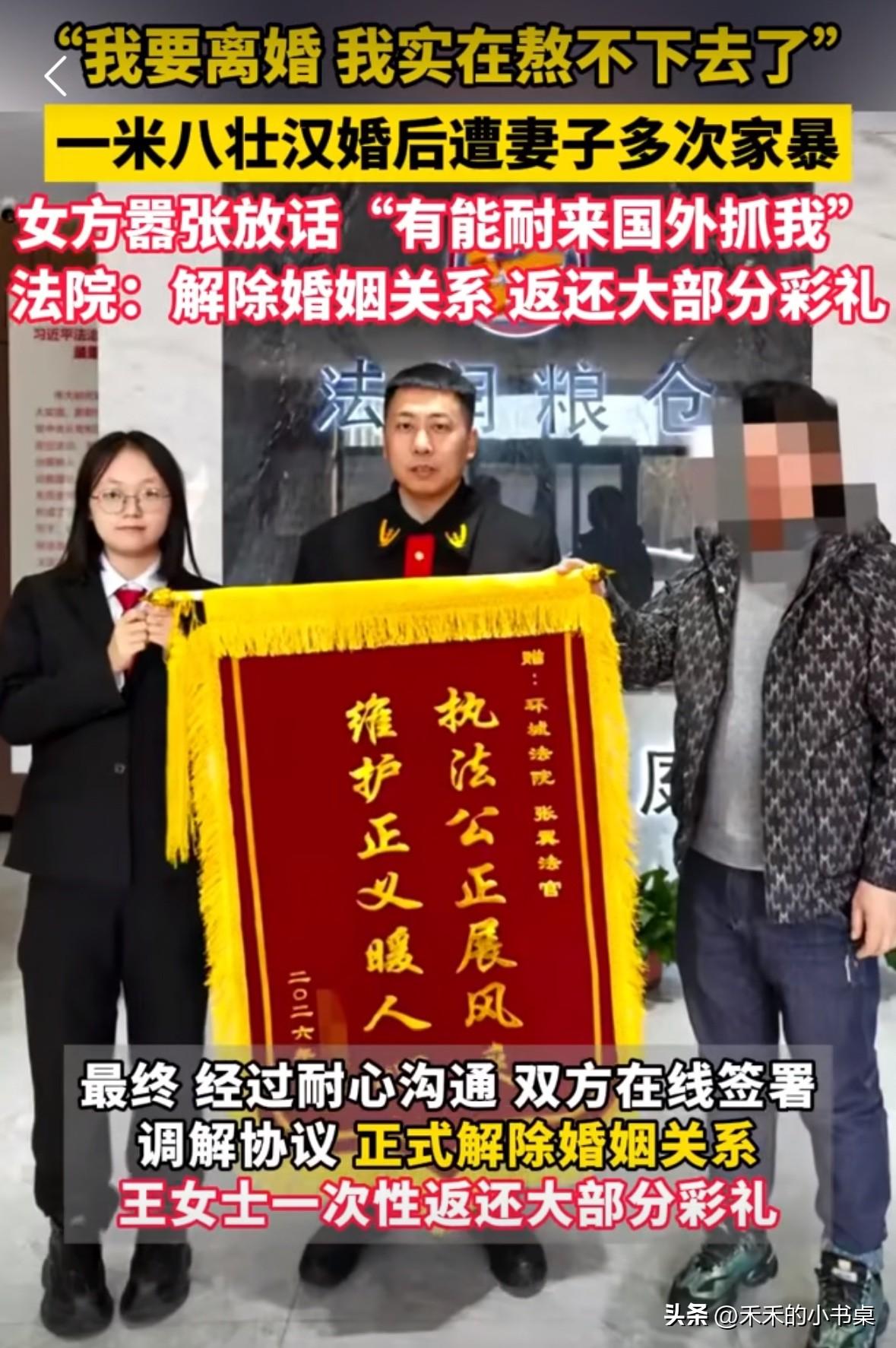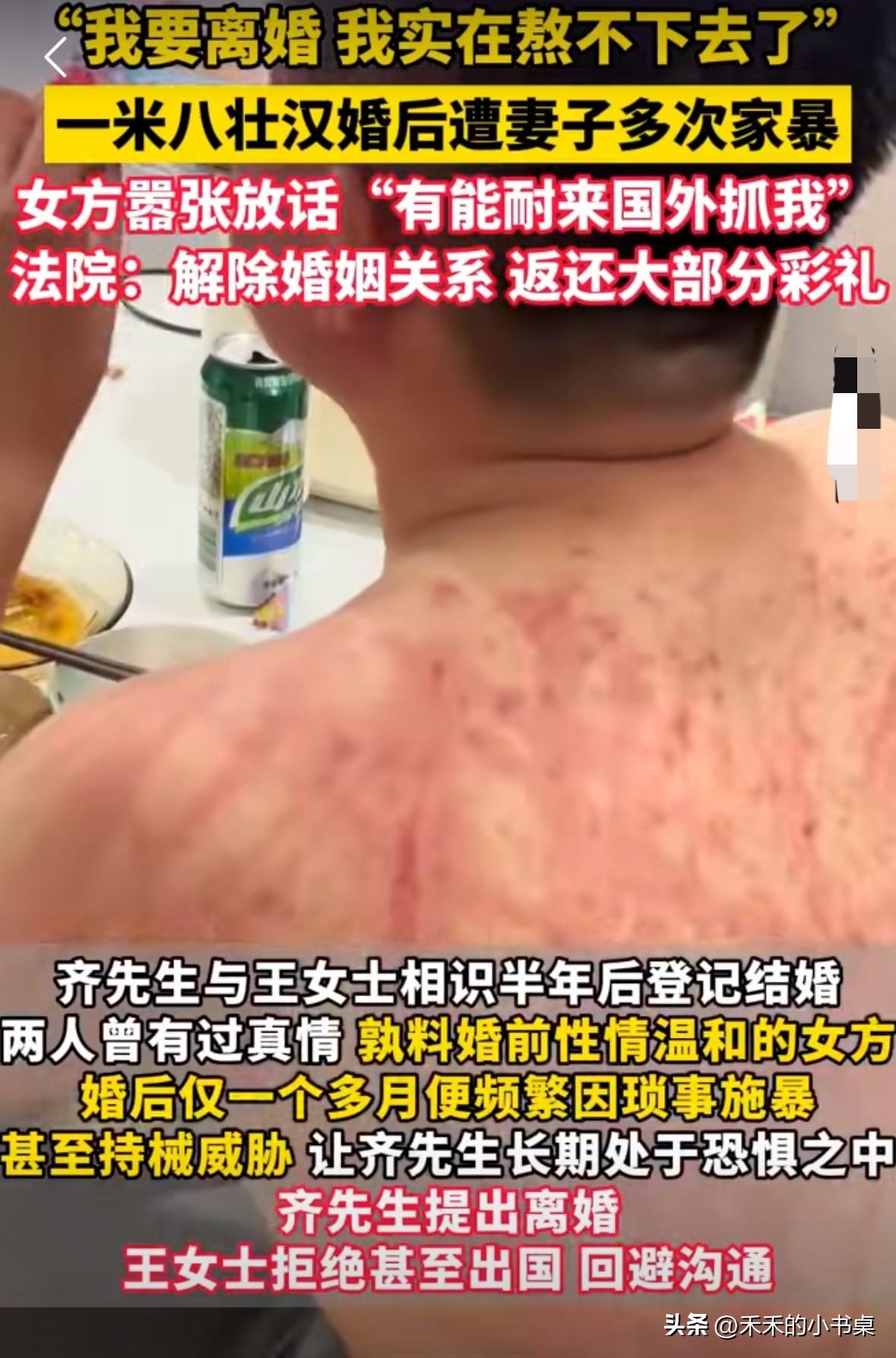 一米八的男子婚后遭到妻子的多次家暴,男子崩溃的说:“我要离婚,我实在熬不下去了!” 据了解,婚前女子性情温和,婚后一个月就频繁因为琐事对男方施暴。 丈夫离婚,女子不同意,于是男子拿着自己的伤情照片还有医院诊断证明起诉离婚。 女子却躲到国外,对法官言语辱骂,并说:“我在国外,你们管不着,有本事来国外抓我。” 最终,经过多方耐心劝导,双方正式离婚,妻子返还已大部分彩礼!