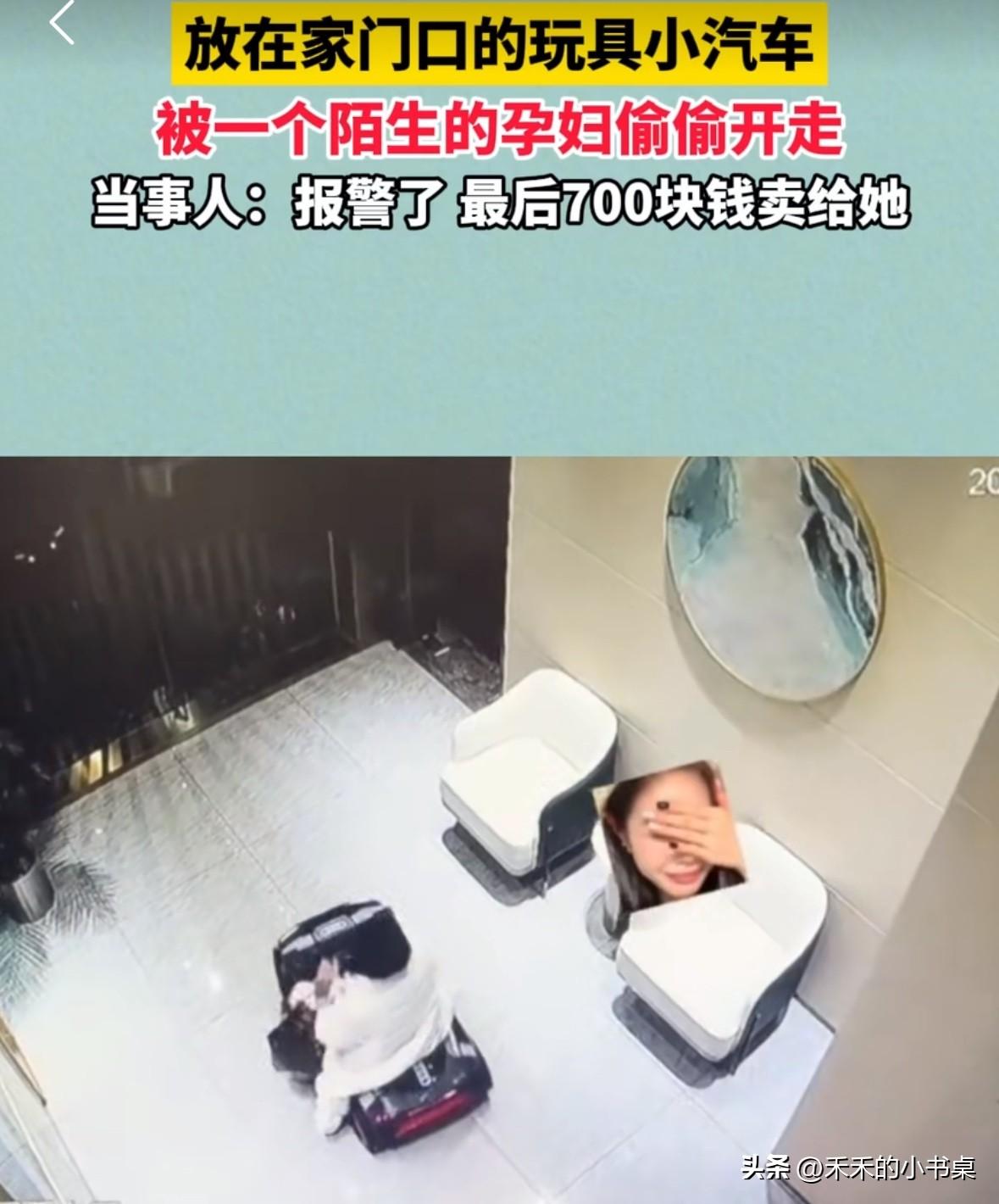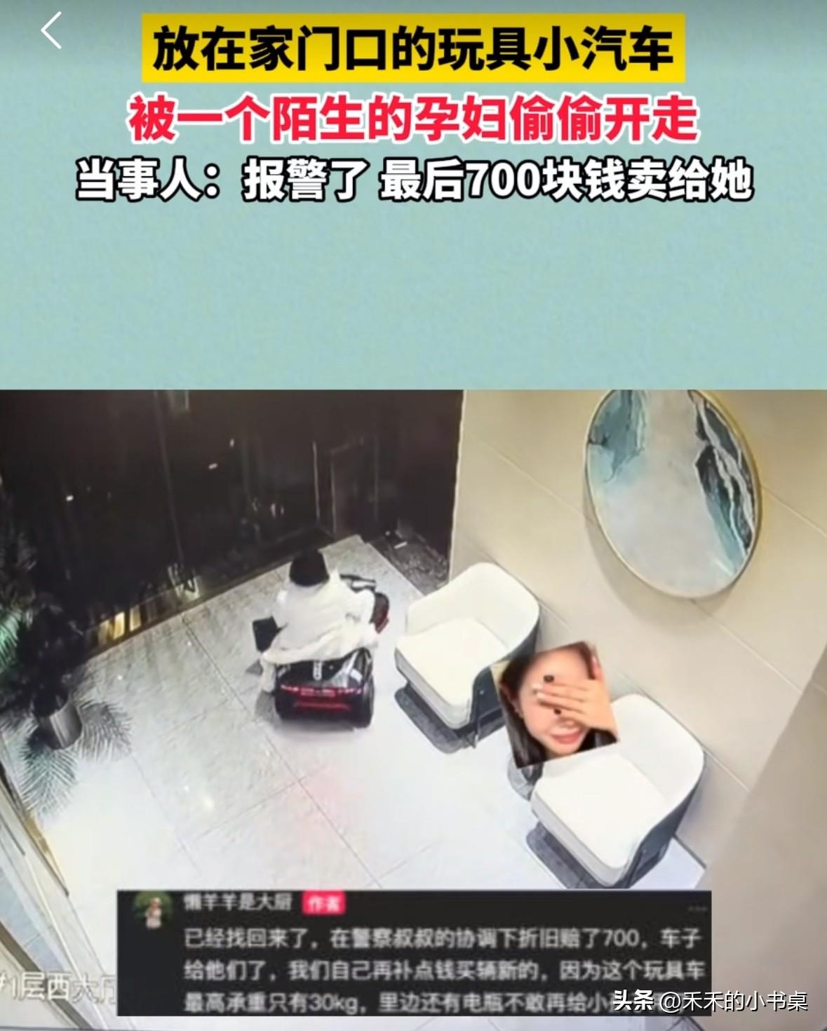 女子放在家门口的玩具小汽车不见了,调了监控才发现,是一名陌生白衣女子偷偷开走了。 女子直接报了警,经过警方的调查发现是本小区的人。 于是通过协商,玩具小汽车以700元的价格卖给了白衣女子。 女子说:“这个小汽车承重30千克,她开过了,就不敢再给孩子坐了。” 放人家门口的也敢偷,真是胆子太大了,现在几乎家家门口都有摄像头,你以为你能跑得掉!小偷