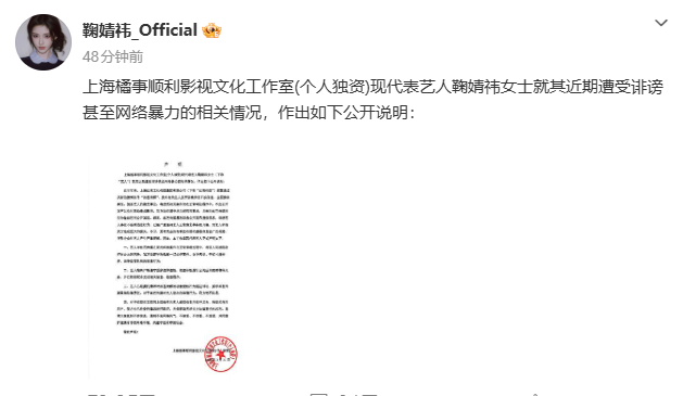 【鞠婧祎方已配合完成税务相关检查程序】鞠婧祎方发布声明,其中提到,近半年来,上海丝芭文化传媒集团有限公司频繁通过账号“丝芭传媒”,发布“有关艺人及所涉案件的不实信息,企图操控舆论,扼杀艺人的演艺事业”。针对税务问题,声明表示“艺人始终严格遵守国家法律法规,依法积极履行公民应尽的纳税等义务,并已积极配合完成相关抽查、检查程序”。鞠婧祎工作室声明