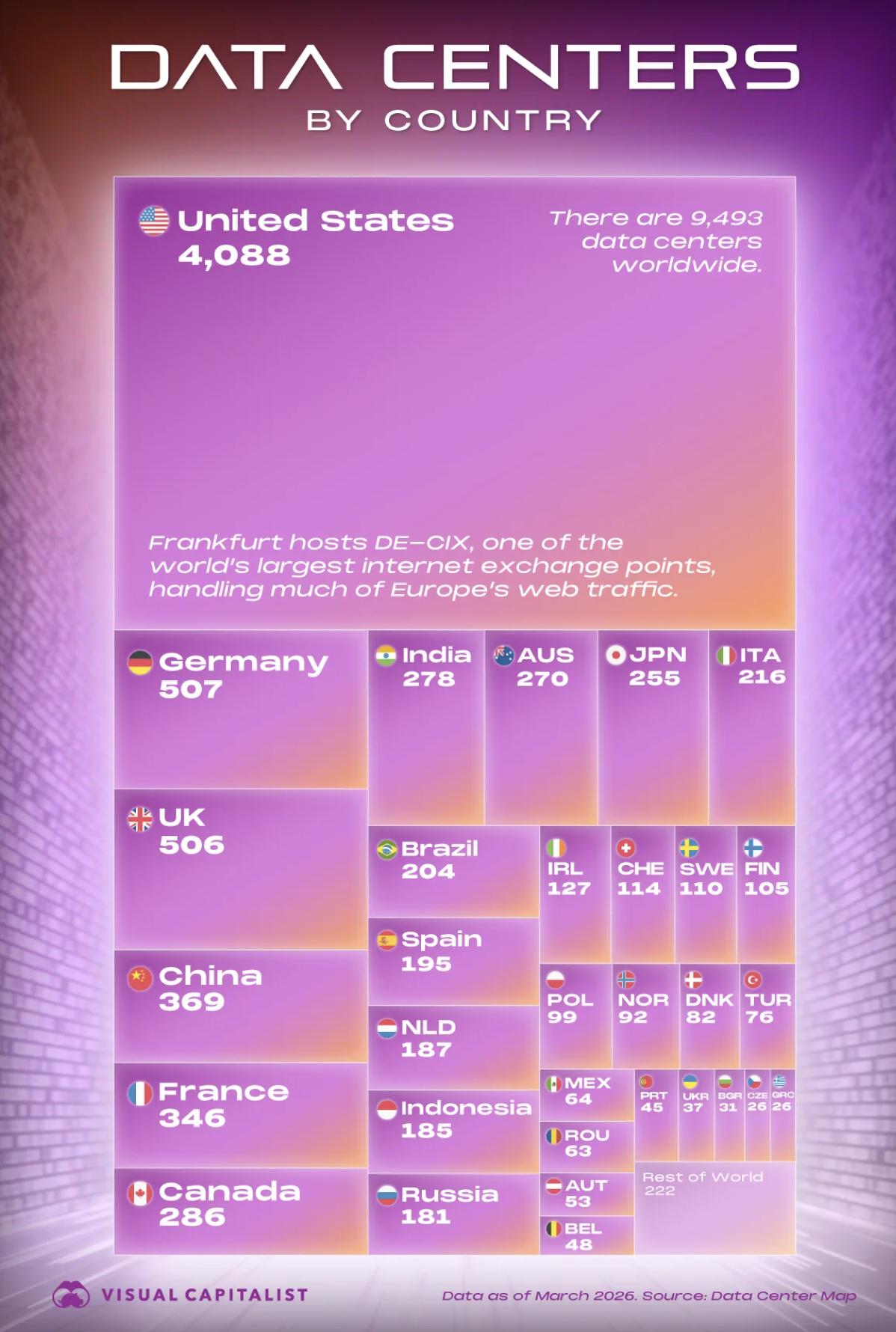 外媒:美国以4,088座数据中心占据全球43%的份额,遥遥领先;德国(507座)与英国(506座)几乎并列第二,仅相差1座;中国以369座位居第四,法国(346座)紧随其后。加拿大、印度、澳大利亚均拥有270座以上。 欧洲FLAP-D走廊(法兰克福、伦敦、阿姆斯特丹、巴黎、都柏林)仍是全球云计算与AI基础设施的核心枢纽。 随着AI扩张,数据中心建设正加速向终端用户靠近以降低延迟,未来选址将面临土地与资源限制,部分开发商开始探索社区共赢模式或太空数据中心等创新方案。