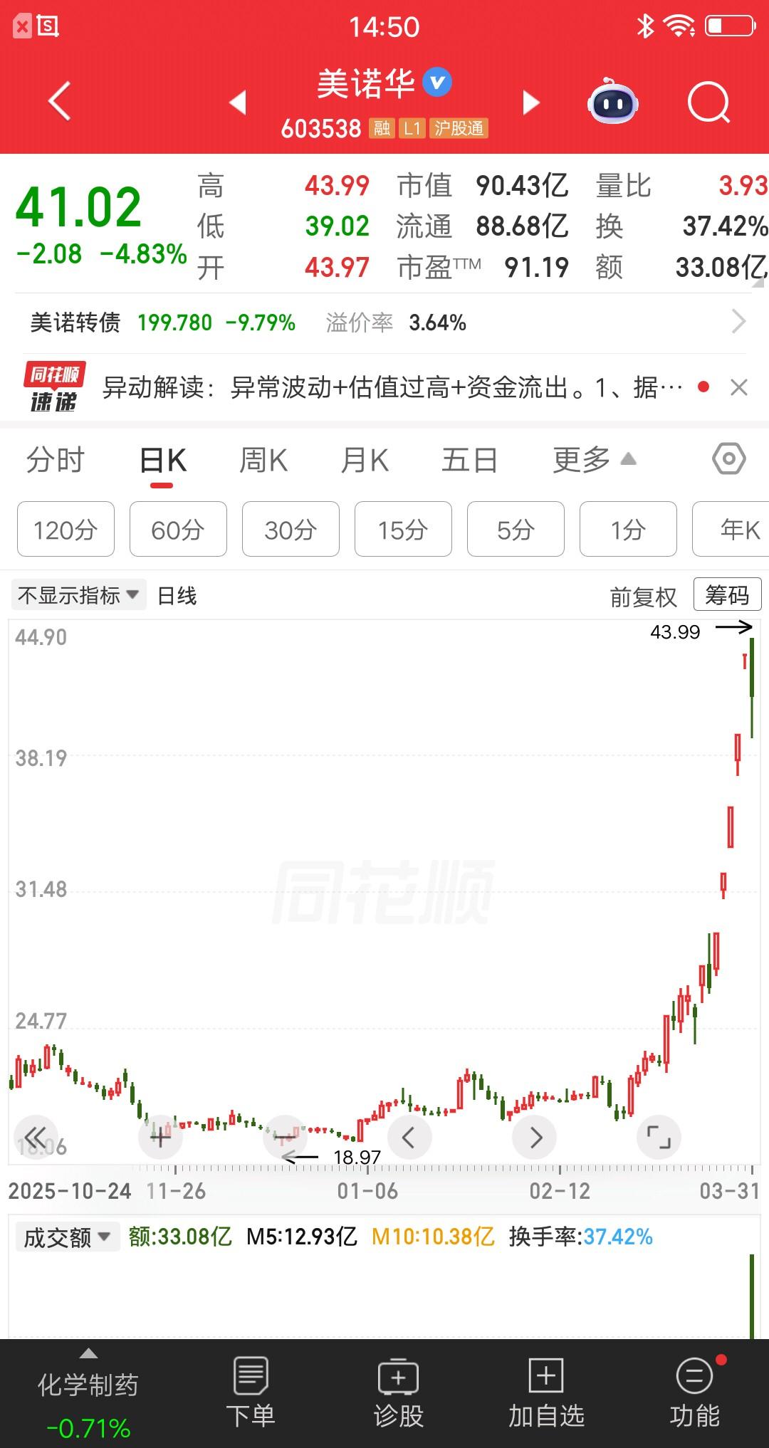 股市有句名言“新手死于追高”,这是无数散户亏出来的经验。广西的一位股民,今天在39.92元买了美诺华200股。他在社区分享了逻辑,日线看该票五连板了,辨识度已经有了,而且向上应该还有五个板的空间,参考的是华电辽能。 今天美诺华分歧了,在深水负五负六的位置稳住了,龙头分歧就是买点。他觉得机会来了,果断建仓了。 他的判断是对是错,目前也没有定论。美诺华股价会怎么走,没人会知道,真心希望他能赚钱。 提醒大家,高位人气股波动较大,除非水平高,否则别去尝试。