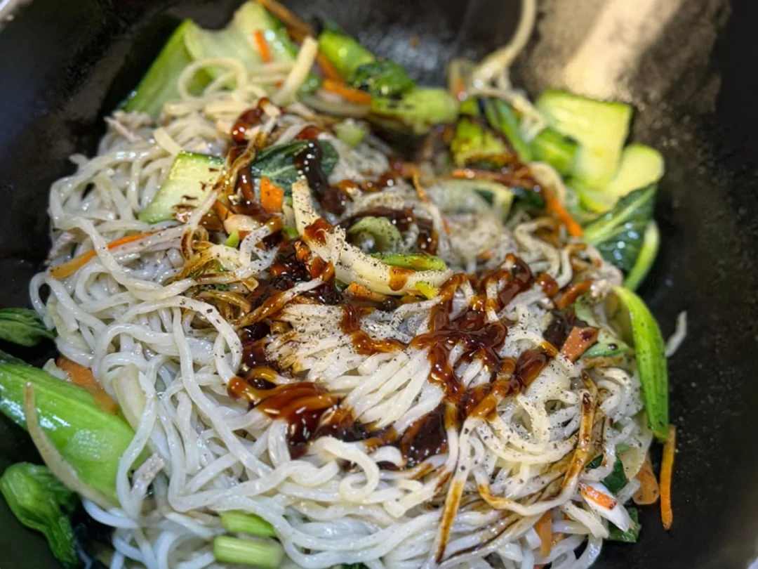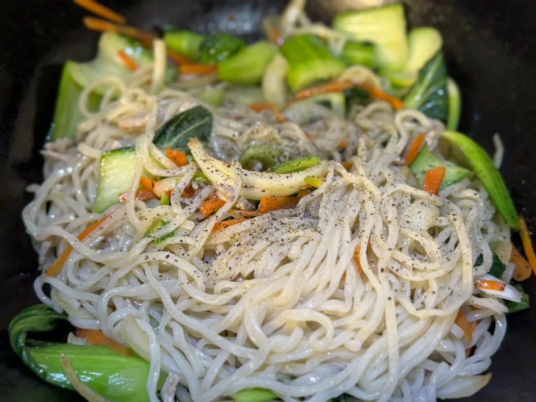 3:锅中加入适量底油,加入面条炒一下,加入之前炒软的蔬菜,加入黑胡椒碎,蚝油,老抽,大火炒拌均匀即可。