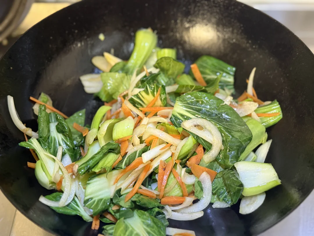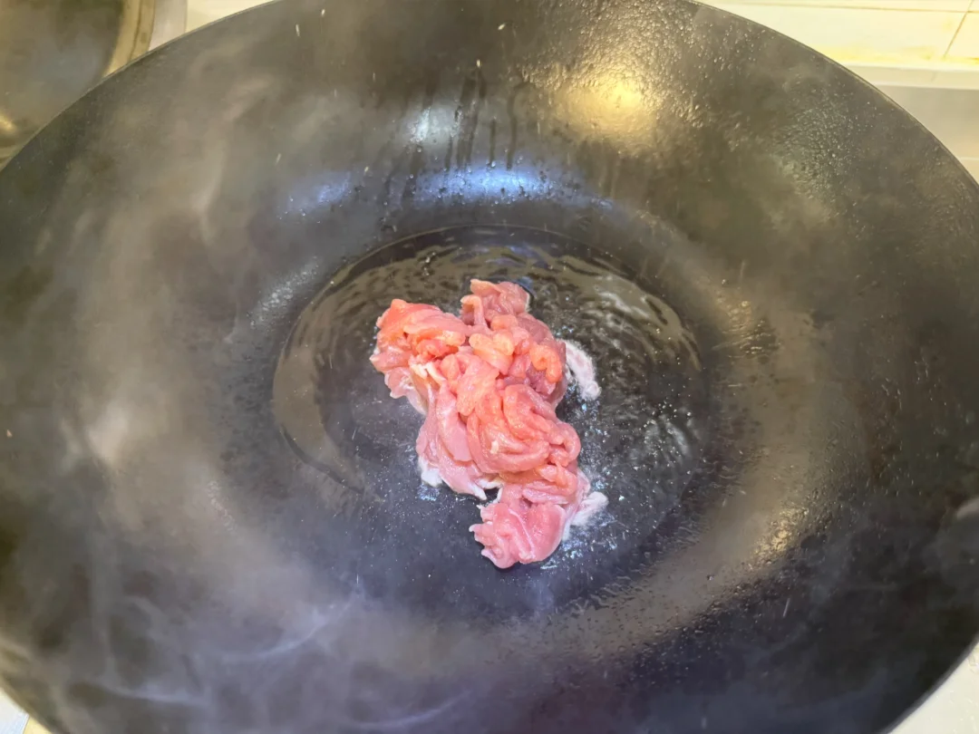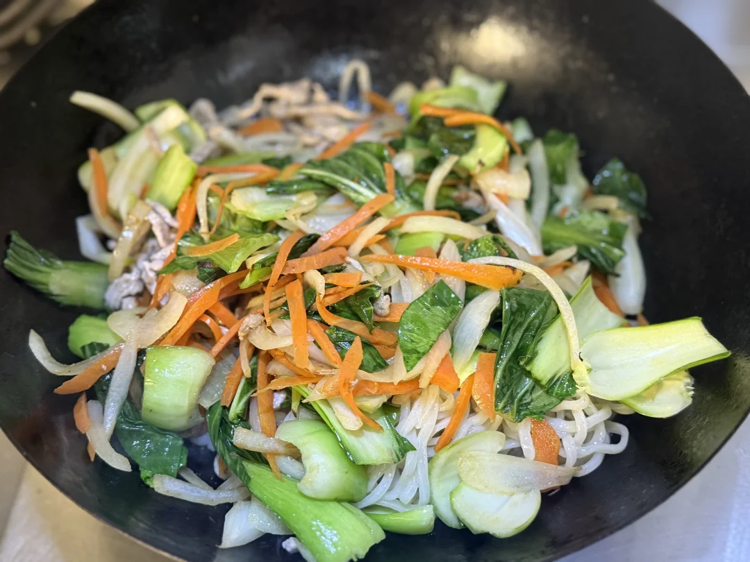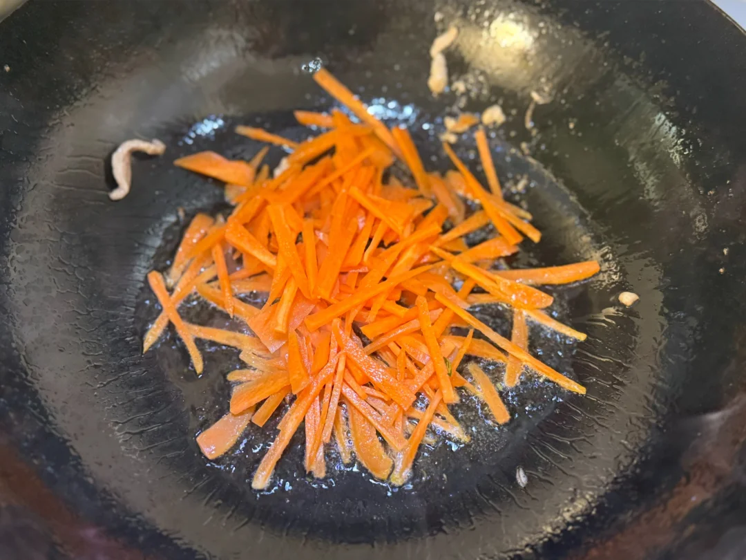 2:肉丝炒出油脂,加入胡萝卜丝,洋葱丝,青菜段,炒断生,盛出。