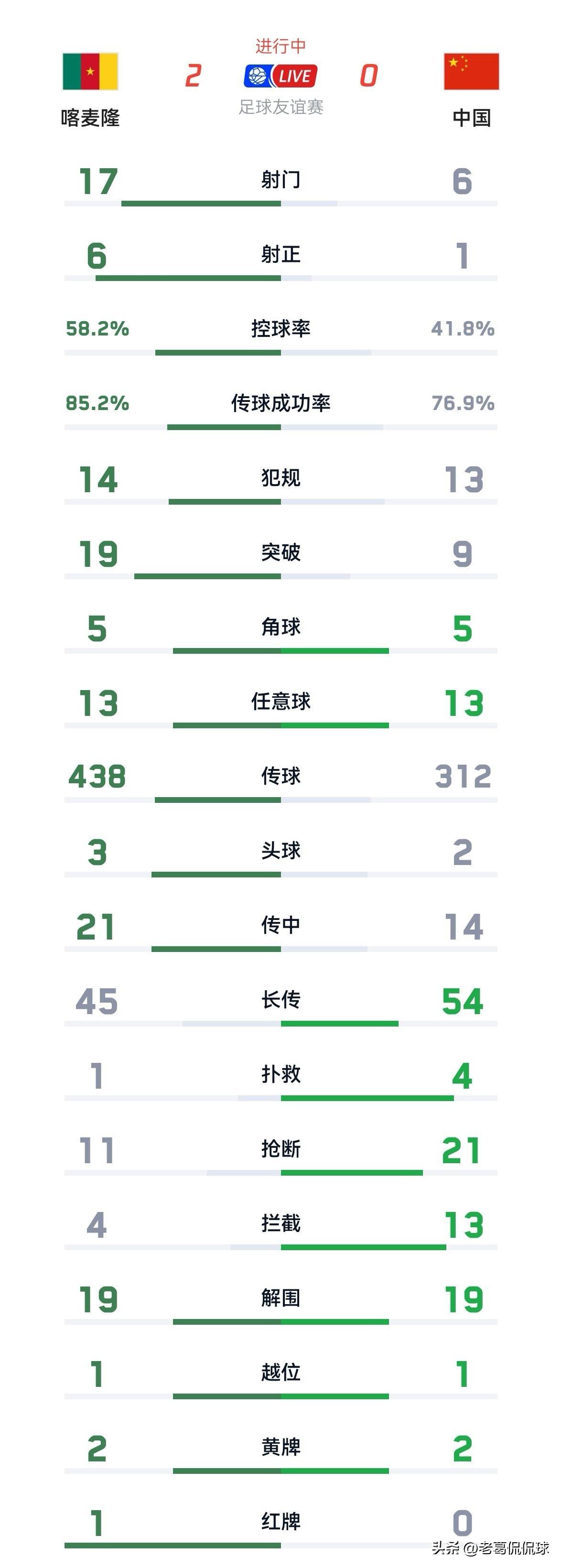 中国男足真是输球不输人!尽管中国男足刚刚在一场国际足联系列赛中以0:2输给了非洲雄狮喀麦隆男足,但是中国男足却在场上展现出了非常棒的精神面貌,真的是输球不输人。本场比赛面对实力更强的喀麦隆队,虽然中国队在射门次数和射正次数方面远不远不如对手,但是中国队在防守端展现出了顽强的拼搏精神,球队并没有因为对手实力强大而畏首畏尾。 坦白说,如果中国男足能够在开场阶段迅速的进入到比赛状态的话,最后的结果或许会有很大的不同,喀麦隆男足正是利用中国队的慢热在开场前十分钟打进了两球。