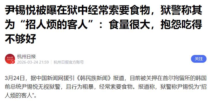 韩国前总统尹锡悦又在监狱里不安分了,负责看管的狱警爆料,尹锡悦饭量很大,经常的大吵大闹,不尊重他们,因为吃不饱,还经常索要食物。 谁能想到,曾经高高在上、风光无限的韩国前总统,如今却在监狱里这般狼狈不堪,丝毫没有了往日的体面。 根据曾在尹锡悦政府时期担任法务部监察长透露,他认识的狱警都私下里说,尹锡悦就是个“招人烦的客人”,态度傲慢又蛮横,从来没把看管他的狱警放在眼里。狱警们说,尹锡悦的饭量大得离谱,远超普通服刑人员,监狱按照规定提供的三餐,根本满足不了他的需求。 更让人难以接受的是,他不仅吵闹,还特别不尊重狱警,说话时语气傲慢,动辄呵斥,仿佛自己还是那个坐在青瓦台里发号施令的总统,而狱警只是他的下属。 有时候狱警按规定拒绝他额外索要食物的要求,他就会变本加厉地吵闹,甚至故意刁难狱警,以此发泄自己的不满。狱警们都不愿意和他打交道,因为每次接触,都会被他的抱怨和蛮横弄得身心俱疲。 尹锡悦已不是当年的总统,他因为内乱头目罪被一审判处无期徒刑,如今背负着8起刑事诉讼,上诉翻盘的希望十分渺茫,这辈子大概率都要在监狱里度过。 而曾经的权力、光环、前呼后拥,全都烟消云散,只剩下狭小的牢房和日复一日的牢狱生活,这种巨大的落差,让他彻底心态失衡。 他现在住的牢房只有6.6平方米,狭小逼仄,只能放下一张折叠床、一个储物柜和一张简易书桌,和他当年居住的青瓦台简直是天差地别。 每天的伙食也只是杂粮饭、海带汤配泡菜,一顿饭的价格还不如一杯普通的美式咖啡,这和他当总统时享用的山珍海味形成了鲜明的对比。 更让他难以接受的是,吃完饭还要自己清洗餐具,没有专人伺候,一切都要亲力亲为。 没有了权力,没有了特殊待遇,甚至连吃饱饭都成了奢望,尹锡悦心中的不满和绝望无处宣泄,只能把火气撒在看管他的狱警身上。 他故意大吵大闹、索要食物、不尊重狱警,其实并不是真的饿到无法忍受,也不是真的看狱警不顺眼,而是想通过这种幼稚又蛮横的方式,证明自己还有“存在感”,宣泄自己从云端跌落泥潭的不甘和愤怒。 面对尹锡悦的无理取闹,狱警们只能按规定耐心劝说、严格看管,既不能过度强硬,也不能放任不管,处境十分为难。 而尹锡悦的律师则站出来反驳,说狱警的爆料是“诽谤”,声称尹锡悦作为服刑人员,一直遵守法律法规。可狱警们的爆料细节详实,还有前法务部监察长的佐证,可信度远高于律师的一面之词。 说到底,尹锡悦的所作所为,不过是一场荒诞又可悲的闹剧。曾经他试图用权力掌控一切,甚至不惜发动内乱,最终落得个无期徒刑的下场。如今身陷囹圄,不反思自己的罪行,反而靠招惹狱警宣泄不满,这般狼狈模样,终究是咎由自取。