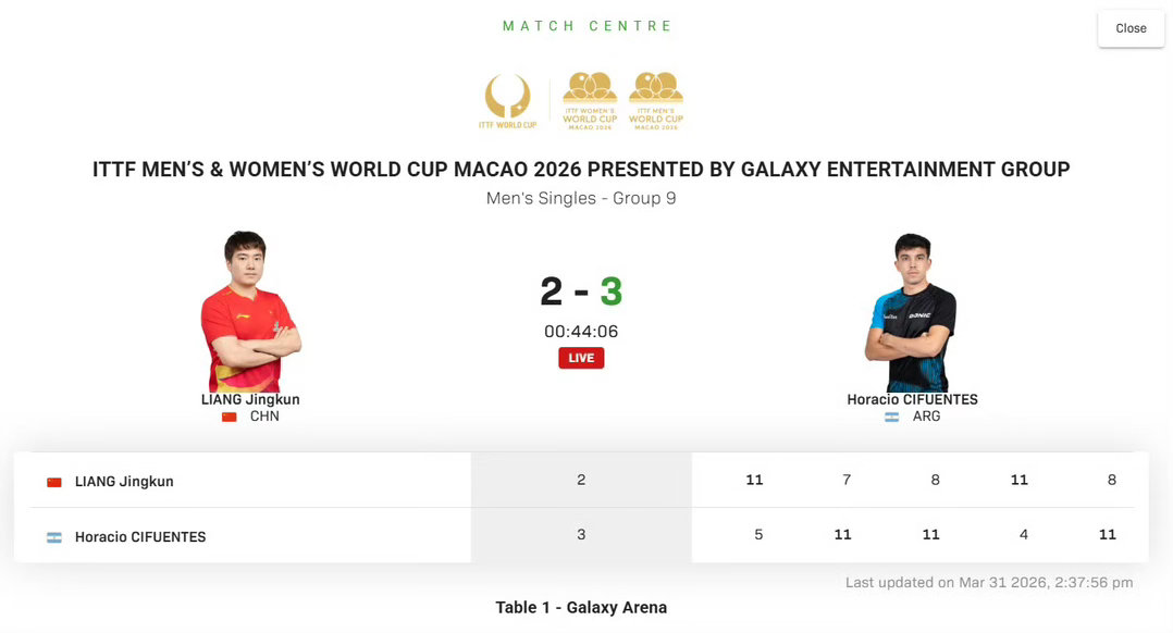 2026澳门乒乓球世界杯男子单打小组赛首轮,国乒主力梁靖崑迎来了本届赛事的首秀,对手是实力不俗的西班牙选手西福恩特斯。经过五局苦战,梁靖崑最终以2-3的比分遗憾落败,无缘开门红,五局具体比分分别为:11-5、7-11、8-11、11-4、8-11。这场爆冷失利,不仅让梁靖崑的小组出线形势变得严峻,也瞬间冲上热搜,引发了球迷们的广泛讨论。