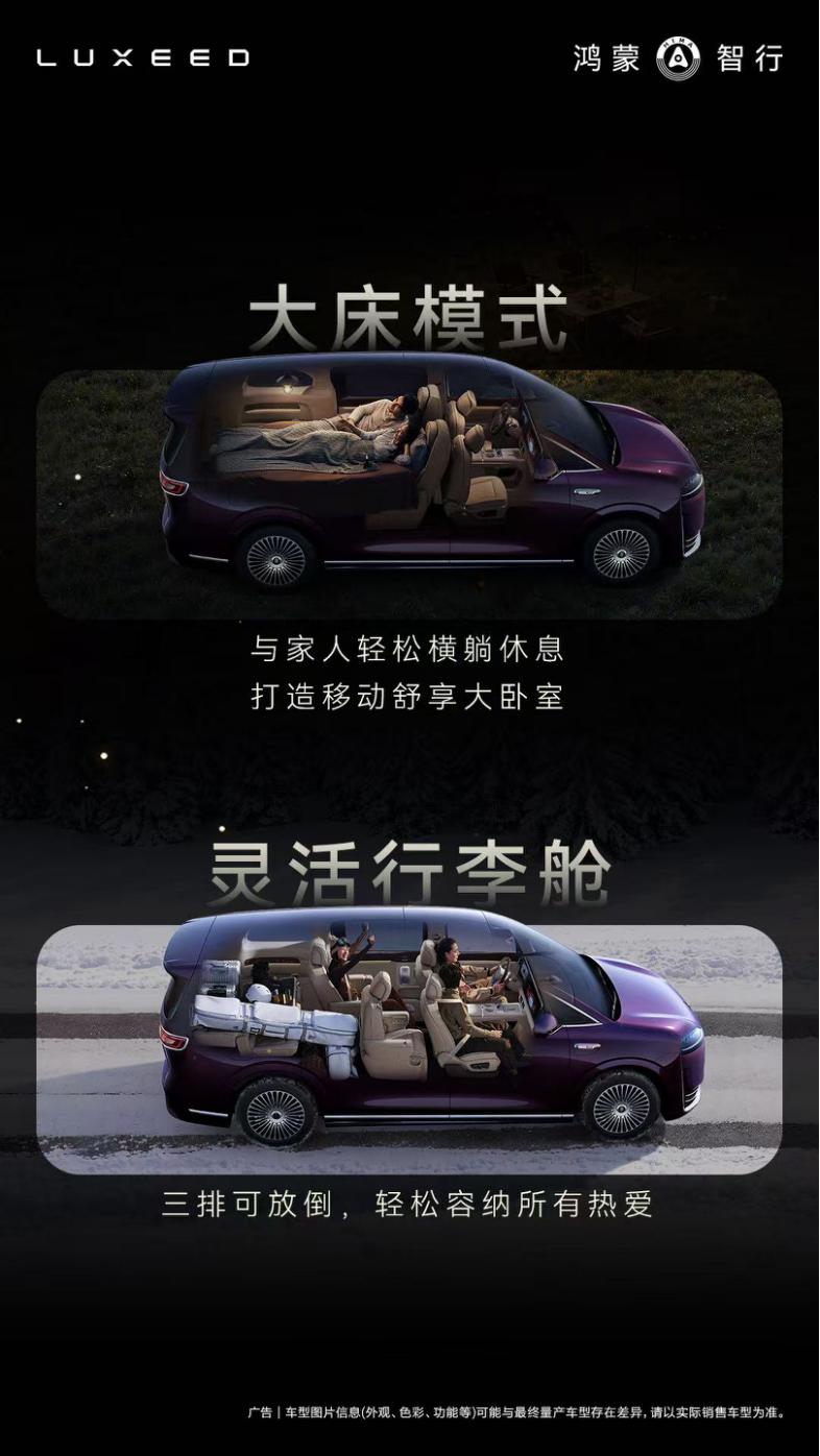 智界V9的百变空间是对旗舰MPV的独特理解 很多人问,为什么鸿蒙智行要做MPV?看完智界V9的细节曝光,答案其实很清晰,因为MPV的大空间,能让华为的技术优势得到最极致的发挥。 二排座椅支持多角度旋转,从45°到90°再到180°,这套系统几乎覆盖了你能经历的所有用车场景,商务接待时,180°旋转秒变移动会客厅;家庭出行时,90°转向方便安装儿童安全座椅;露营时,放倒座椅与第三排组成大床,一家人平躺看星星。而支撑这些场景切换的,是同样考究的内饰工艺,晶钻旋钮的科技感,赤茶橘与绒霞紫的旗舰配色,NAPPA真皮的细腻触感,共同构建了一个无论怎么变换形态都不失豪华感的座舱。 智界V9有着鸿蒙智行对于旗舰MPV的独特理解,它不是在堆砌功能,而是在用科技赋能场景,让空间真正服务于人。