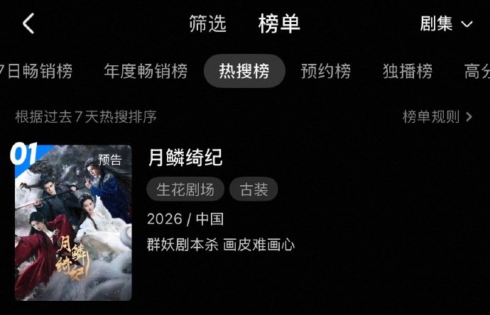 月鳞绮纪优酷热搜榜top1月鳞绮纪优酷播前热度 月鳞绮纪未播先热🔥👖站内剧集热搜榜top🔝1~👖站内开屏、大屏都安排上啦!排面拉满🈵