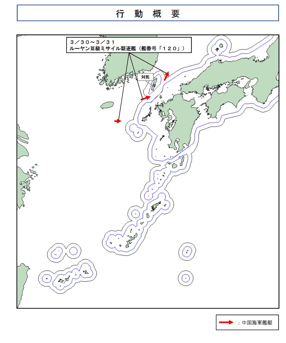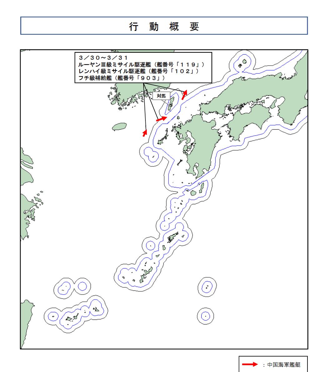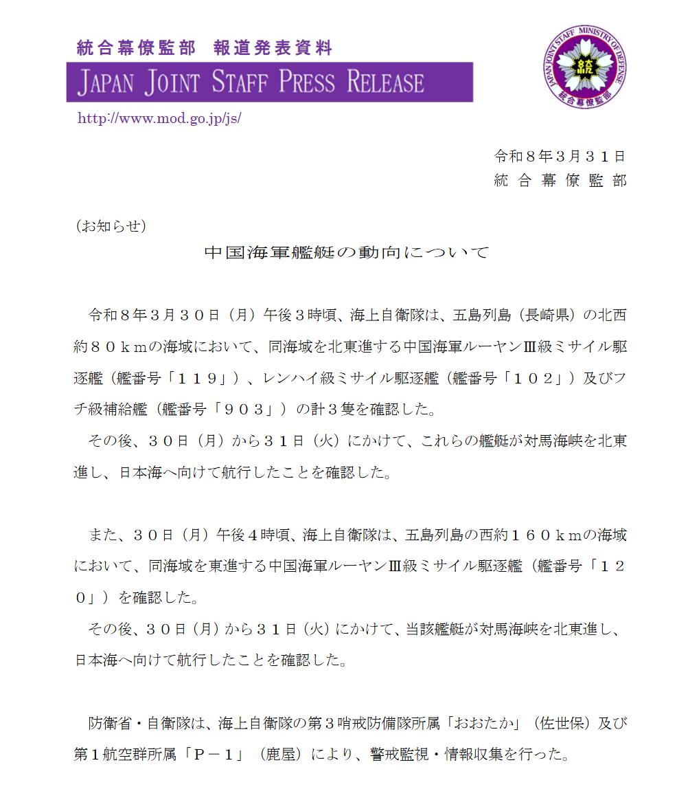 055万吨大驱领衔4艘军舰穿越对马海峡,加上29号过去的815A共5艘军舰进入日本海 3月31日,日本防卫省统合幕僚监部发布通告,3月30日下午3时,中国海军055型102“拉萨”号、-52D型119“贵阳“号导弹驱逐舰以及903型903“可可西里湖”号综合补给舰出现在五岛列岛西北约80公里处。该编队于30日-31日穿越马海峡东北方向航行,驶向日本海。 另外3月30日下午4时052D型120“成都”号导弹驱逐舰出现在五岛列岛以西约160公里,也在30日-31日穿越马海峡东北方向航行,驶向日本海。两个编队共4艘,包括3艘导弹驱逐舰和1艘综合补给舰。 昨天也就是3月30日日本通告了815A型799“金星”号电子情报船3月29日上午穿越对马海峡进入日本海。这样一共有5艘中国海军军舰进入西太平洋参加训练。