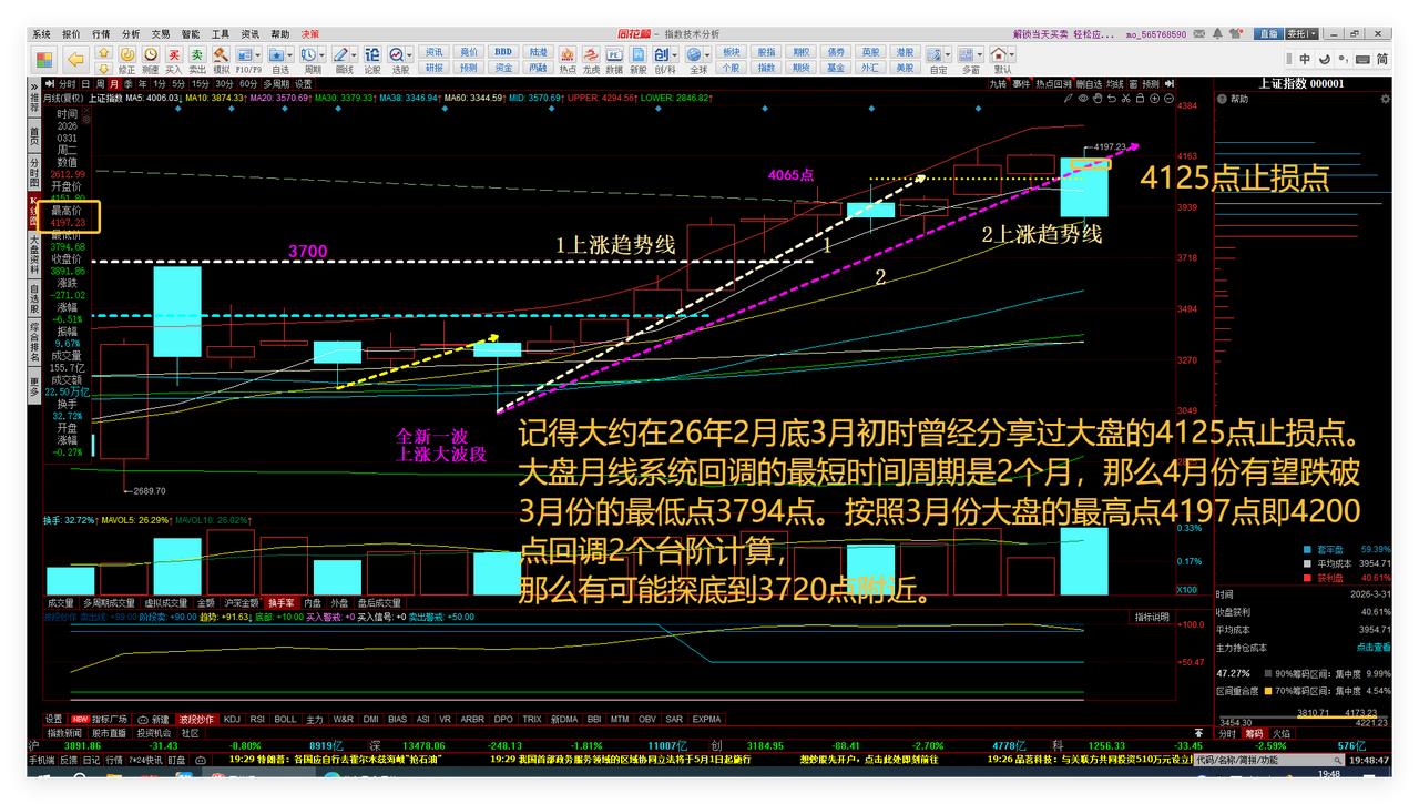 快要完全补缺时,大家撤退了!等待第二次探底或探底后的机会! 1、快要完全补缺时,大家撤退了! 距离完成补缺3955点还有7点时,大家撤退了!导致大盘提前开始第二次探底。 事先,我心理预期的反弹第一目标是3945点,即3855点+90点=3945点! 事先和粉丝们分享时说先看10日线。敬请参阅附图1。 2、等待第二次探底或探底后的机会! 记得大约在26年2月底3月初时曾经分享过大盘的4125点止损点。 大盘月线系统回调的最短时间周期是2个月,那么4月份有望跌破3月份的最低点3794点。按照3月份大盘的最高点4197点即4200点回调2个台阶计算,那么有可能探底到3720点附近。敬请参阅附图2。 具体情况,边走边看吧。 老铁们下期再见。