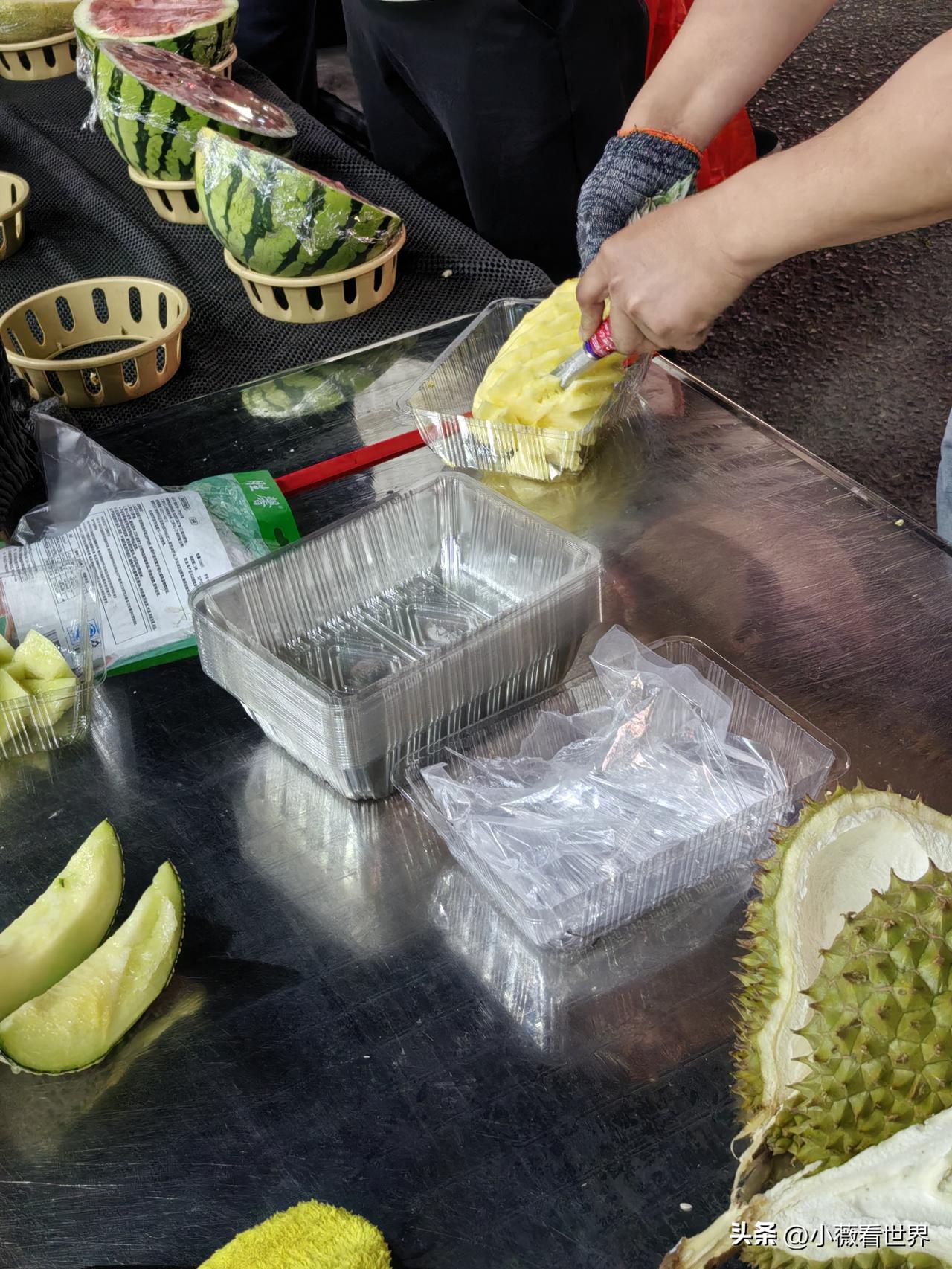 看见菠萝摊前写着10元一个,就挑了一个,守摊的小伙子赶紧拿过去,帮忙去皮。