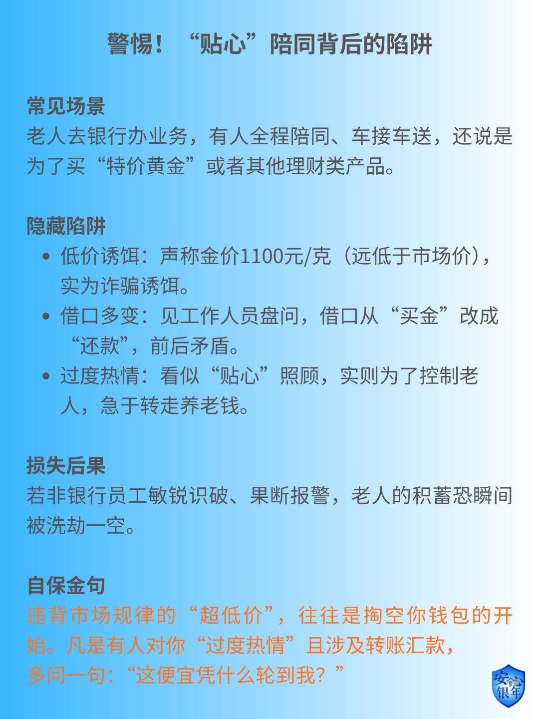 安徽合肥,近日一名老人去银行办业务,有人全程陪同、还车接车送,还说是为了买“特价黄金” 千万别被这“贴心”的表象骗了!这极可能是一场针对老年人的围猎。 银行柜员发现老人意识模糊,陪同男子却急着重置密码,声称要买1100元一克的黄金。要知道,当时金价远高于此,这种“天上掉馅饼”的低价,实则是诈骗团伙精心设计的诱饵。男子见工作人员盘问细致,借口从“买金”改成“还款”,前后矛盾,只想赶紧转走老人的养老钱。 若不是银行员工敏锐识破、果断报警拖延时间,老人的积蓄恐怕瞬间就会被洗劫一空,留下无尽的悔恨,这里给细心的银行人员一个大大的赞! @安心银年违背市场规律的“超低价”,往往是掏空我们钱包的开始。 凡是有人对我们“过度热情”且涉及转账汇款,一定要多问一句:“这便宜凭什么轮到我?” 所有违背常理的“便宜”,都在暗中标好了我们付不起的代价 新闻取材链接:-41537865.html