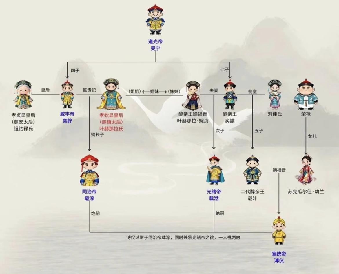慈禧太后与道光帝、咸丰帝、同治帝、光绪帝,宣统帝,五位皇帝的关系。 简单来说,道光帝是她公公。 咸丰帝是她丈夫。 同治帝是她儿子。 光绪帝是她外甥,更是咸丰帝的亲侄子。 因为光绪帝的妈妈是慈禧太后的亲妹妹,爸爸是咸丰帝的七弟。 宣统帝溥仪是她丈夫的侄孙,宗法上属于是咸丰帝和她的孙子,因为溥仪被过继给了同治帝,并且兼承光绪帝之祧。 溥仪的生父载沣虽然是光绪帝的弟弟,不过是异母弟,生母并非慈禧太后的亲妹妹,所以溥仪和慈禧太后并没有血缘关系,只有宗法上的关系。 慈禧太后 咸丰帝 光绪帝 清朝