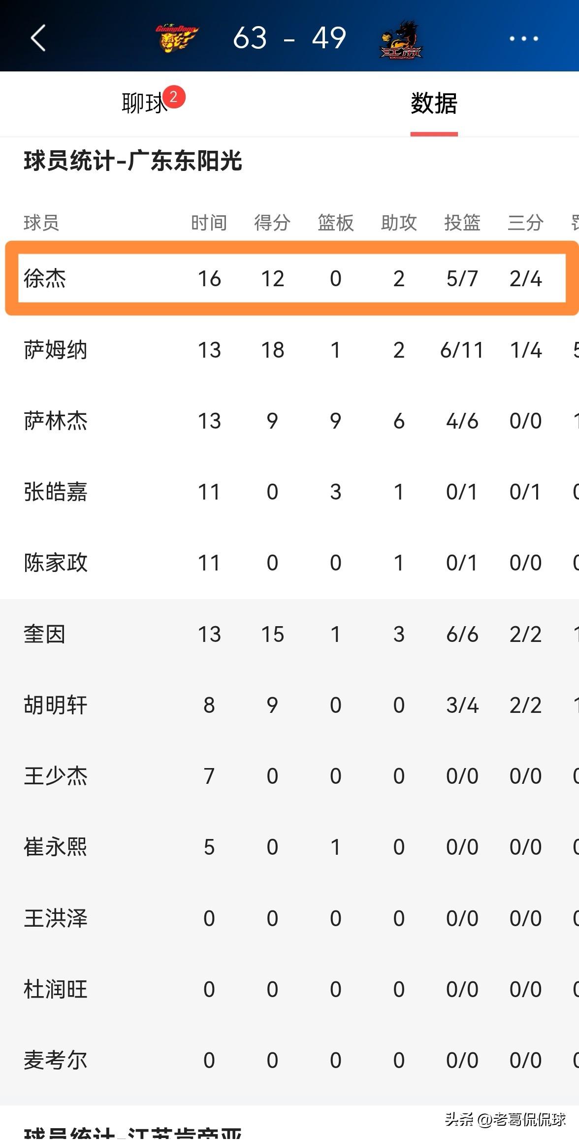 广东东阳光球星徐杰的状态真是太让人惊喜了!在今天广东东阳光主场迎战江苏肯帝亚的比赛中,目前双方半场战罢,广东东阳光以63:49领先对手14分。让人感到非常惊喜的是,徐杰的状态越来越好了,他在首发出战的16分钟里,投篮7中5,其中三分球4中2非常高效的砍下12分,还有2助攻,没有出现任何的失误他的场上正负值为+8。 自从徐杰重回球队的首发阵容后,徐杰的状态真是一天比一天好,这对于广东东阳光来说绝对是一个天大的好消息。