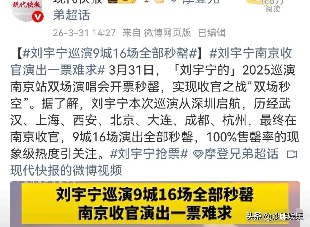 刘宇宁,太让人惊喜了! 3月31日,刘宇宁毫无意外地又冲上了热搜。这次不是因为新剧路透,也不是因为综艺名场面,而是他的2025巡演南京收官场——开票直接秒罄,而且是双场全空 。 更绝的是什么?回头一看战绩表:从深圳启航,一路跑过武汉、上海、西安、北京、大连、成都、杭州,最后在南京收官,整整9城16场,居然全部秒罄,一点水花都没溅起来 。 这要是放在股市里,就是连续16个一字涨停板,连个开板让你上车的机会都不给。 以前总有人说刘宇宁是靠OST出圈的“网剧BGM专业户”,国民度不低,但未必能转化成实打实的票房。结果这次巡演直接给了所有质疑者一记响亮的耳光。 每一场开票,服务器都得抖三抖。有网友回忆,成都站开票时,售票平台服务器疑似直接被挤到崩溃 。任贤齐曾在一档节目中吐槽,发动全家30多口人帮忙抢刘宇宁的票,结果0.6秒就没了,愣是一张没捞着 。 李乃文说得更夸张:“这哪是秒没啊,这是半秒没!” 甚至连同行的王玉雯都在综艺里跟孙红雷疯狂安利,还不忘补一句“他票老难抢了哥哥”,直接把孙红雷都整好奇了 。 放眼如今的演唱会市场,很多歌手开巡演,要么是热门城市秒罄,冷门城市慢慢卖;要么是首站热度高,收官场疲软。但刘宇宁倒好,从头到尾全是“秒空”,连一点缓冲期都没有。南京收官场开票前,大麦上的“想看”人数就已经飙到了15万+,妥妥的修罗场预演 。 为什么这么顶?除了粉丝能打,更深层的原因是——刘宇宁已经成了娱乐圈罕见的“五边形战士”。 影视寒冬里,资方比谁都精明。这次巡演期间,出现了内娱最魔幻的一幕:爱奇艺、万达的老板们穿着应援色衣服坐在台下,举着荧光棒,送的花篮上写着“朝气蓬勃中年团”,据说有人甚至揣着剧本直奔后台谈合作 。 资本疯抢的背后,是一笔算得明明白白的账:找刘宇宁拍戏,等于买了一份“主演+OST天王+宣传大使”的打包套餐。他主演的《一念关山》《折腰》全是爆款,商业价值拉满 。在这个预算紧缩、遍地雷区的时期,这种“零风险、高回报、不塌房”的安全资产,谁不想要? 回看刘宇宁的履历,你会发现他的逆袭几乎是无法复制的。从丹东街头月薪800的餐馆学徒,到如今万人场馆的绝对主宰,他用的是最笨的办法:把剧本贴满出租屋的墙,练台词练到肌肉记忆;拍打戏脚部骨折,瞒着剧组吊威亚硬上 。 这种“工伤级”的真实感,让他的粉丝粘性高得吓人。有的粉丝为了看他,把术后首次远行留给了他的演唱会;还有粉丝方阵集体穿婚纱赴约,场面堪比大型婚礼现场 。 有人说,刘宇宁是流量。但看完这9城16场全秒罄的成绩单,我更愿意相信,这是实力攒出来的观众缘。当资本褪去浮华,当泡沫被挤破,能留下的一定是那个在寒冬里还能让人抢破头的“硬通货”。 9个月,9城,16场,100%秒罄。 刘宇宁用这份成绩单告诉所有人:这年头,顶流不顶流,票房会说话。南京收官在即,下一个六年之约,恐怕更难抢了。