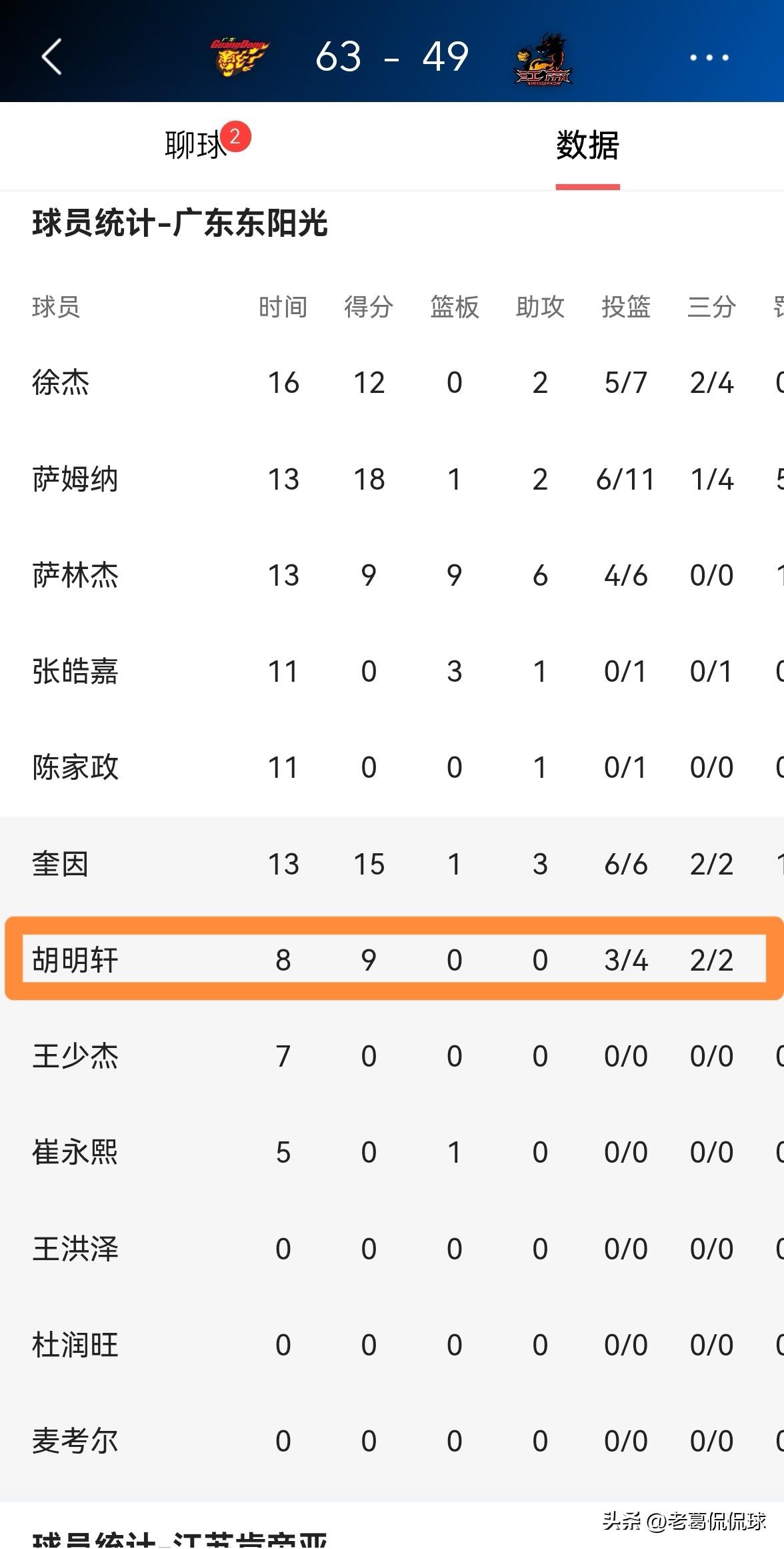 广东东阳光超级球星胡明轩真是发挥超常!在今天广东东阳光主场迎战江苏肯帝亚的比赛中,目前两队的上半场比赛已经结束,广东东阳光以63:49处于领先。让人感到非常意外的是,在前两节比赛中,胡明轩一反常态竟然打出了超常的表现。 在上半场比赛中,胡明轩替补出战8分钟,投篮4中3,其中三分球2中2、罚球1中1相当高效的砍下9分,他的场上正负值为+17。 实事求是的说,以胡明轩在最近一段时期里的低迷表现来看,他在上半场比赛中的表现完全是超常发挥。