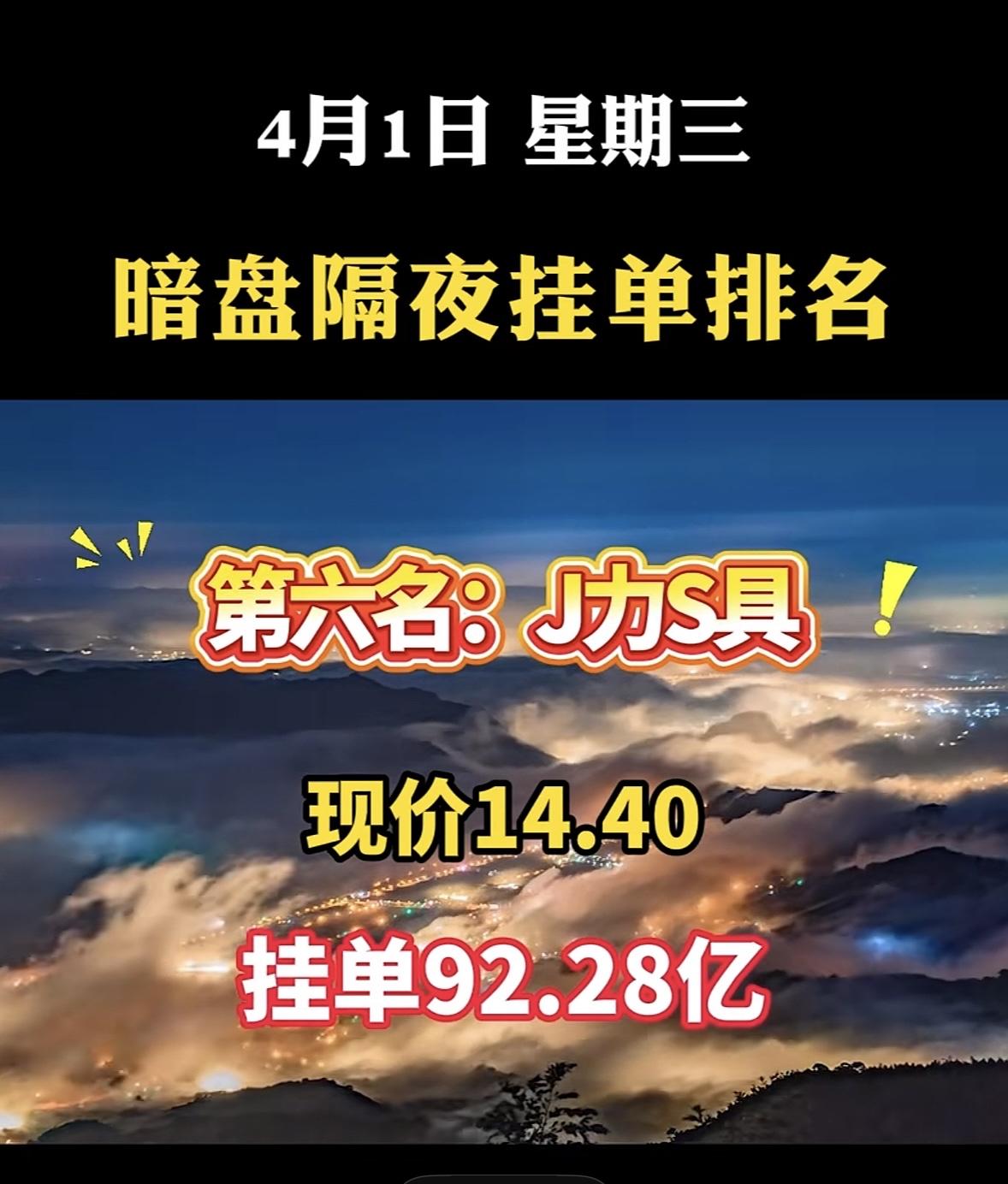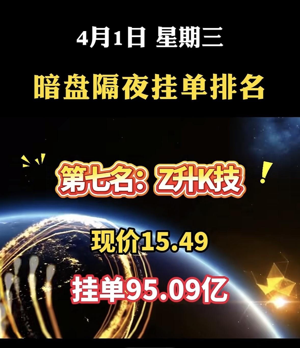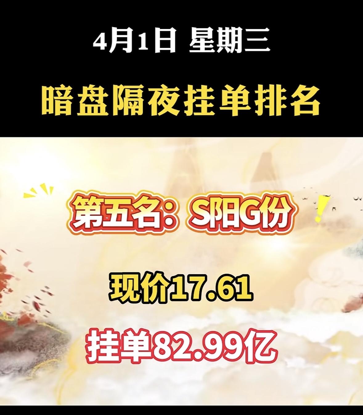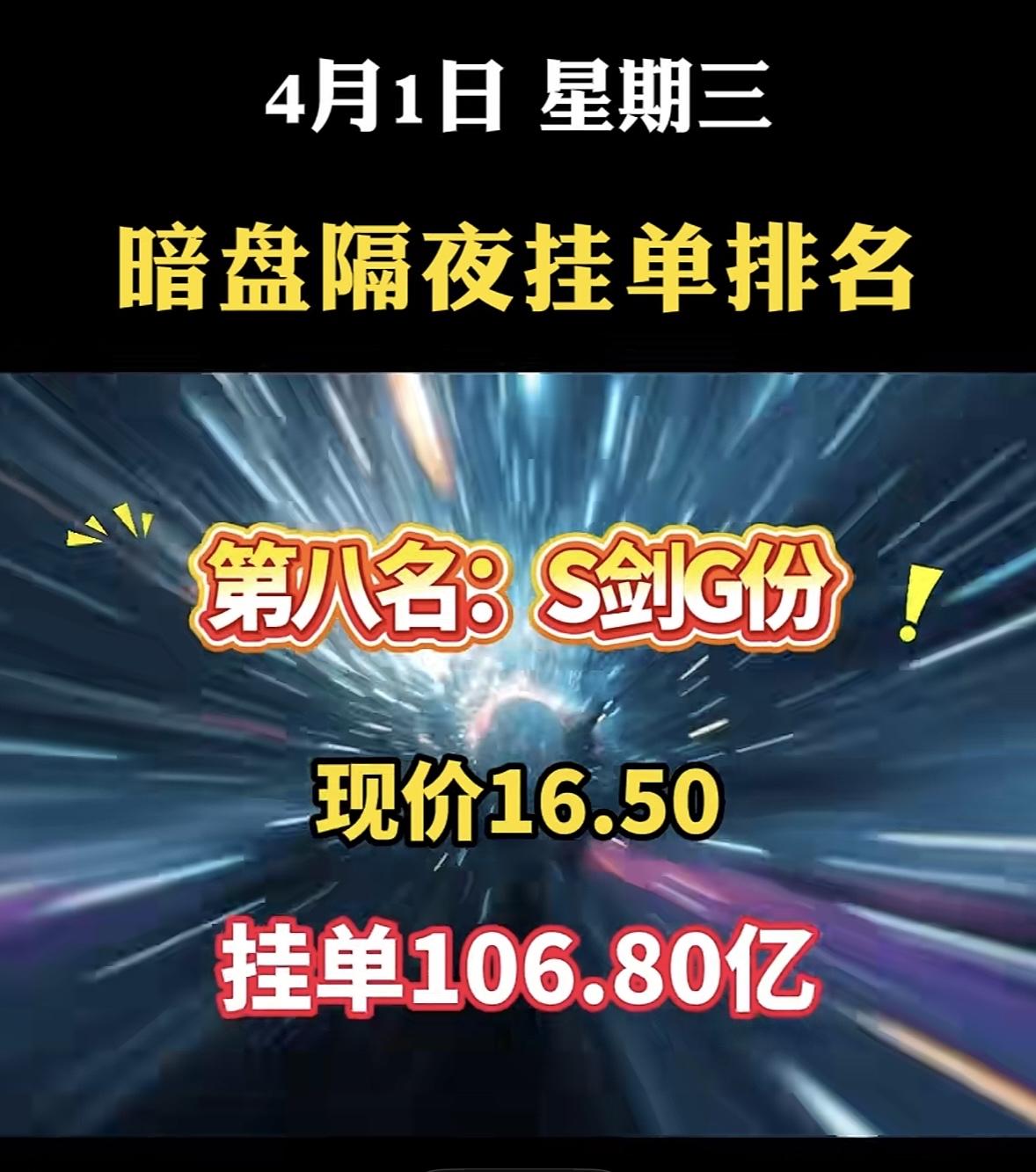 4月1日周三暗盘隔夜挂单排行榜一览表 暗盘隔夜挂单可是A股里大资金、专业机构提前布局的核心战场。就说这神剑股份,在暗盘隔夜挂单排行里排第八,现价16.50,挂单高达106.80亿!之前3月30日它就以15.00元的现价,81.54亿的隔夜挂单排第二名。 很多散户只盯着开盘竞价、日内分时这些,却忽略了暗盘隔夜挂单这个最真实、最超前的资金信号。大额隔夜挂单虽不代表股价必涨,但它是资金提前预判产业逻辑、抢筹核心标的的体现,就像市场主线的“前置信号灯”。神剑股份在商业航天等赛道有布局,这巨额挂单说不定预示着它后续有大动作。